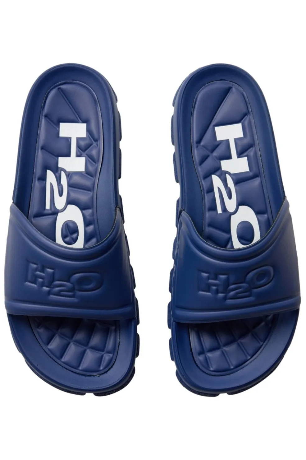 Badesandal i mørkeblå med H2O-logo. Fremstillet på samme italienske fabrik siden 1982. Den åbne tå og vandafvisende materialer gør sandalen velegnet til pool og badeværelse.