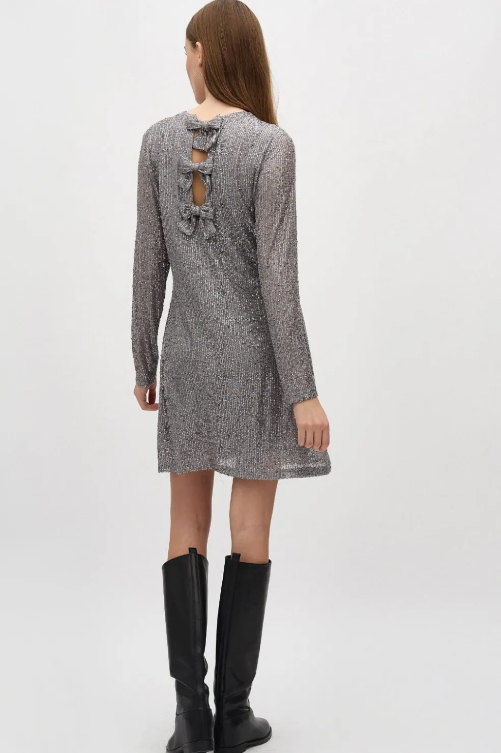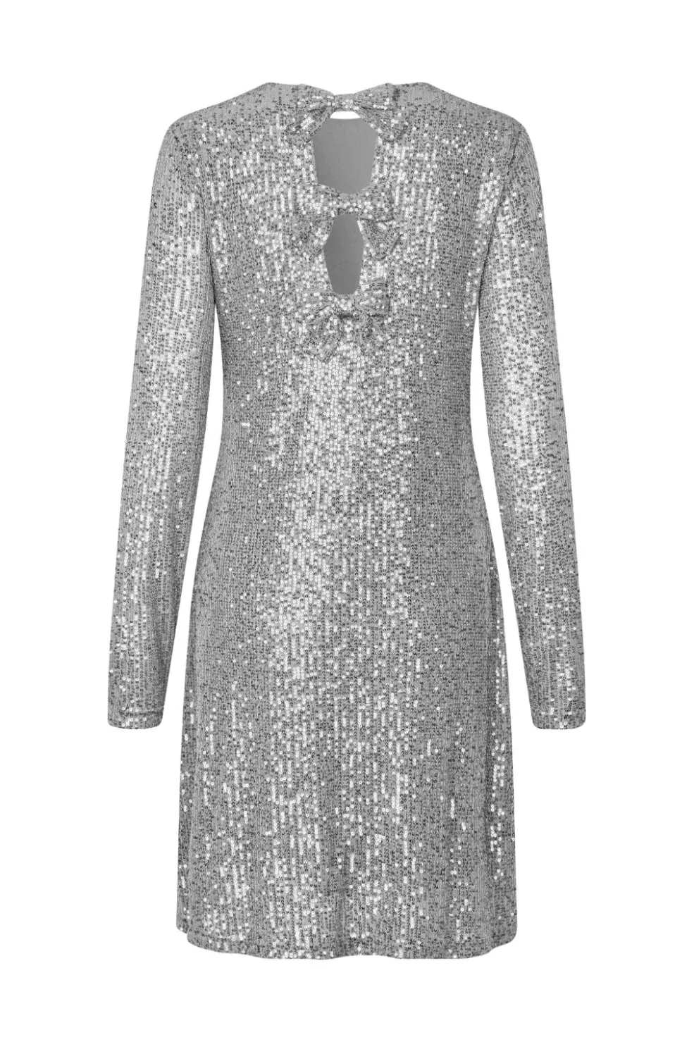 Sølvgrå kjole fra MbyM med pailletter over det hele. Kjolen har rund hals, lange ærmer og en lårlang længde. På ryggen sidder sløjfedetaljer og en nøglehulskæring.