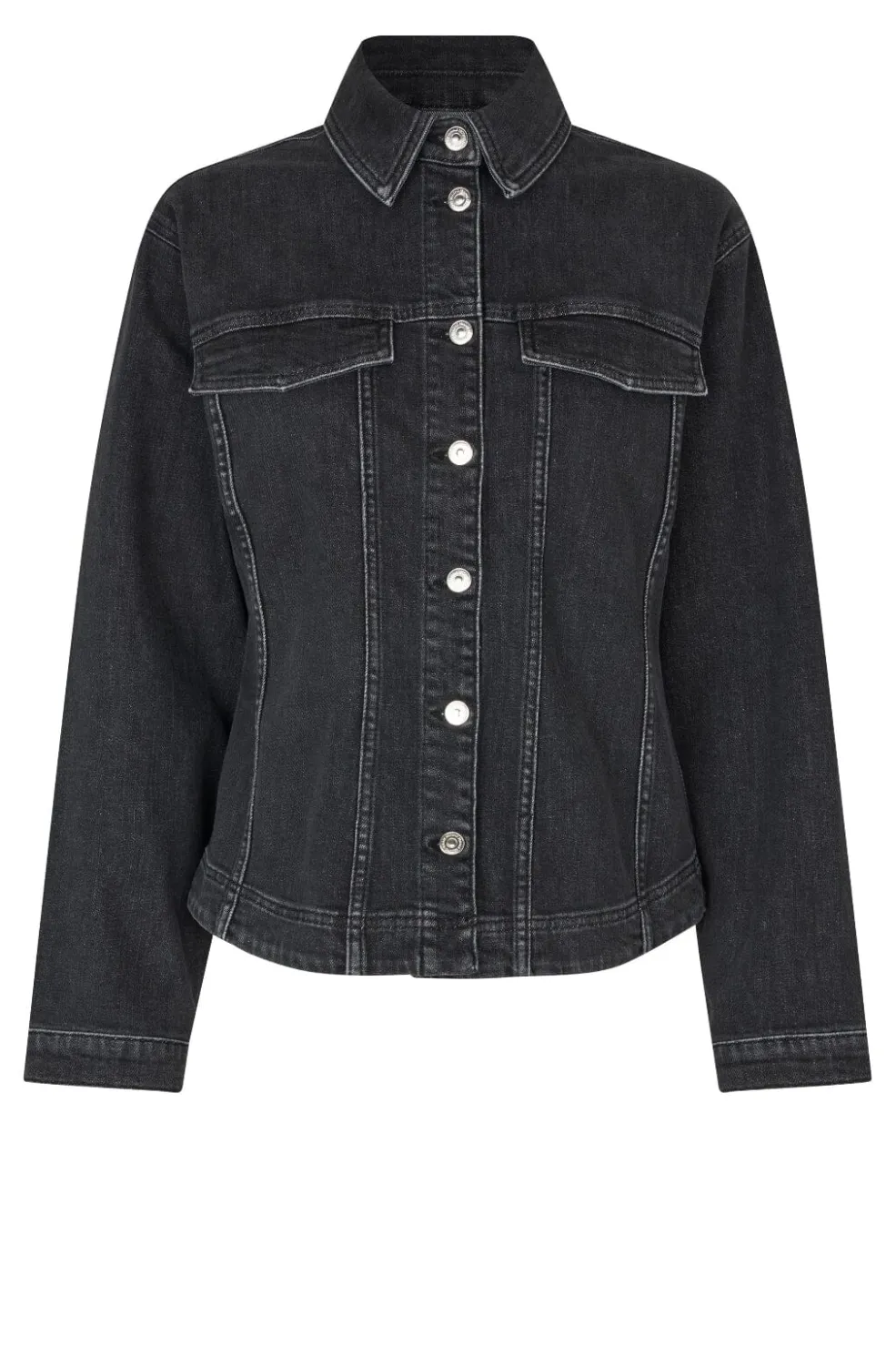 Sort denimjakke fra Second Female med knaplukning foran, to brystlommer med flapper og en klassisk skjortekrave.