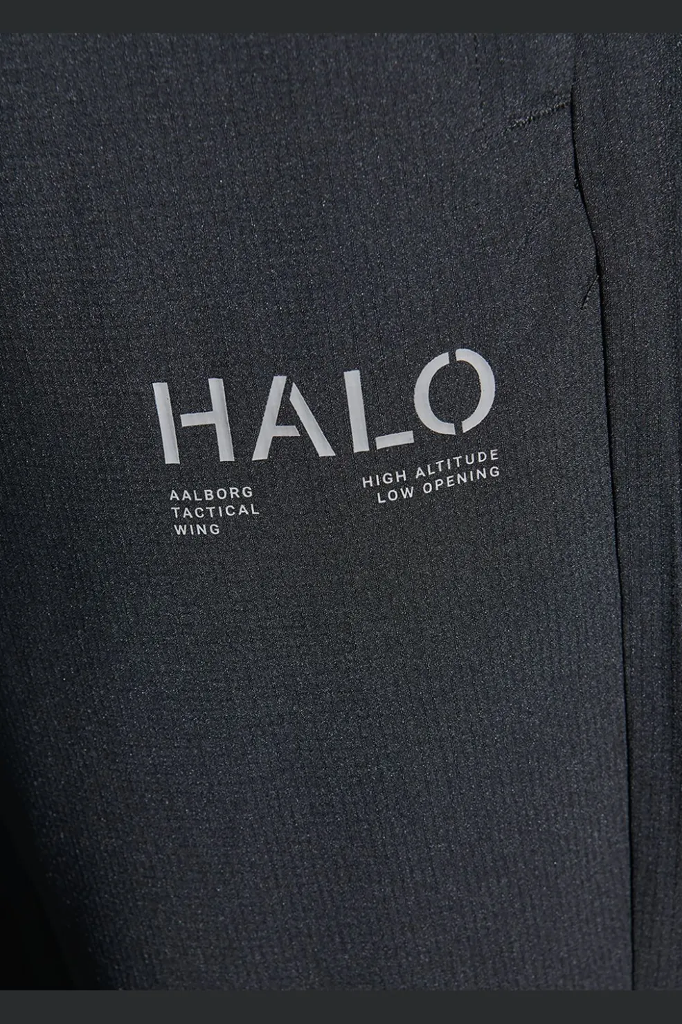Sorte bukser fra Halo, lavet af strækbart ripstop-materiale. Bukserne har ankel-længde og lige ben med elastik og justerbar snøre i taljen.