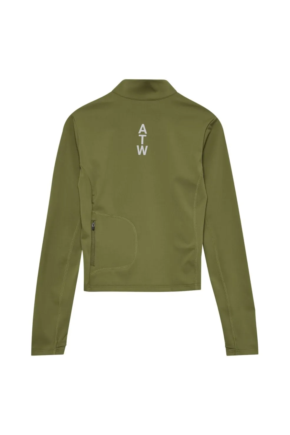 Zip-jakke fra Halo i olivengrøn. Jakken har refleksprint med HALO-logoet foran og ATW-logoet bagpå samt dekorative syninger.