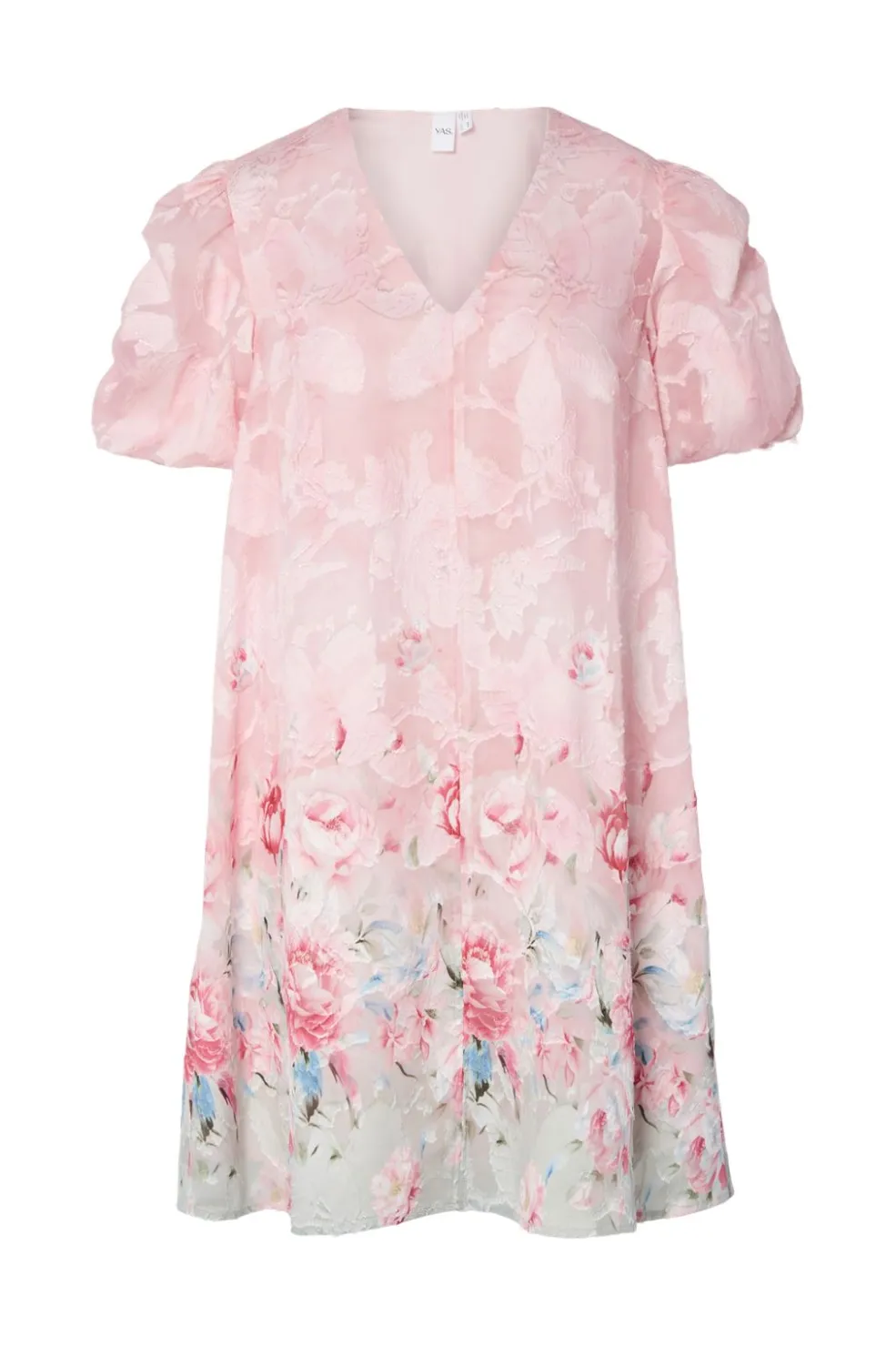 Kort kjole fra Y. A.S med blomstermønster i pink og blå. Kjolen har pufærmer og V-udskæring. Den går til låret og har et gradvist skiftende mønster fra top til bund.