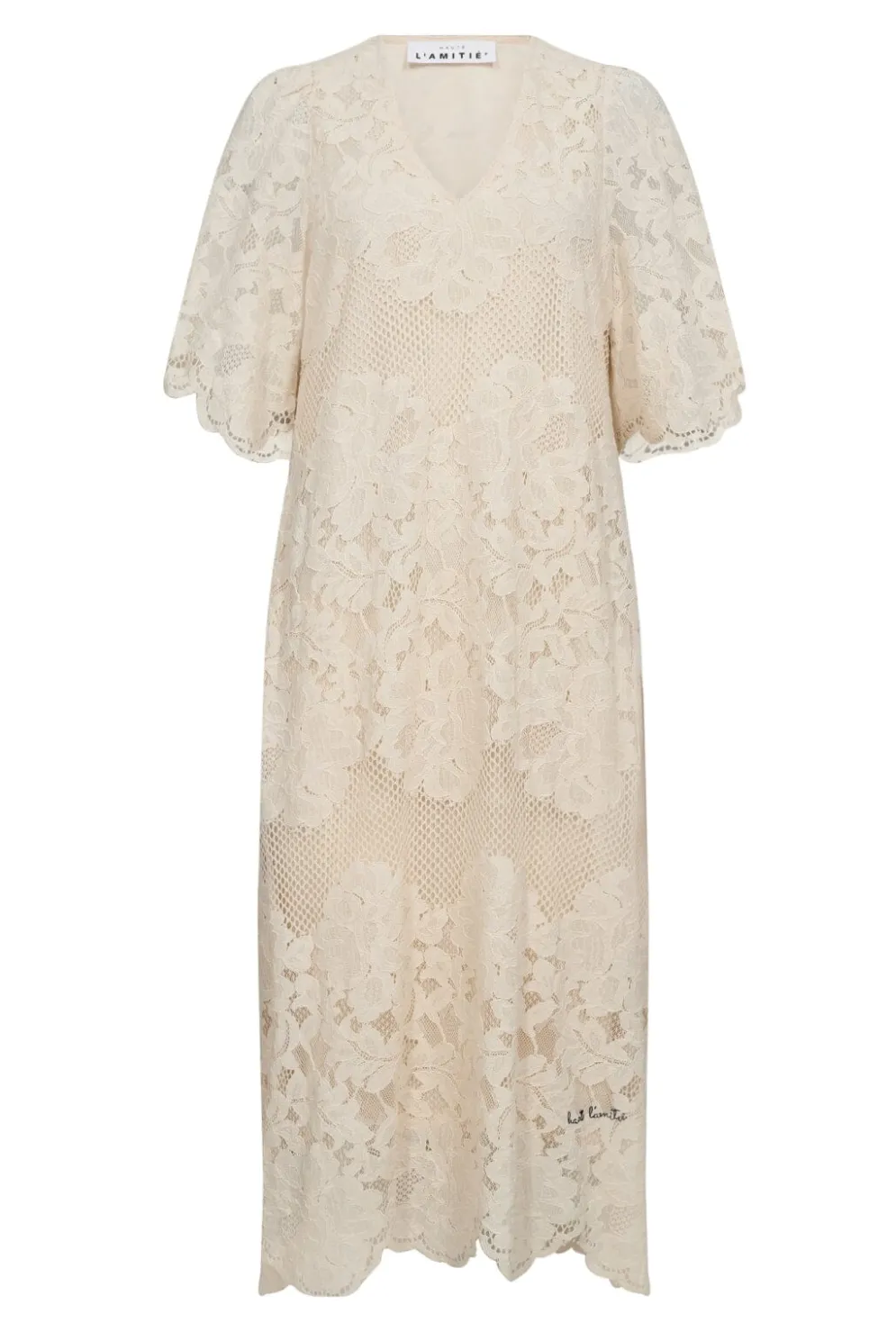 Blondekjole fra Haute L’Amitié i en perlehvid nuance. Kjolen har et blomsterblonde-mønster med V-udskæring og korte ærmer.