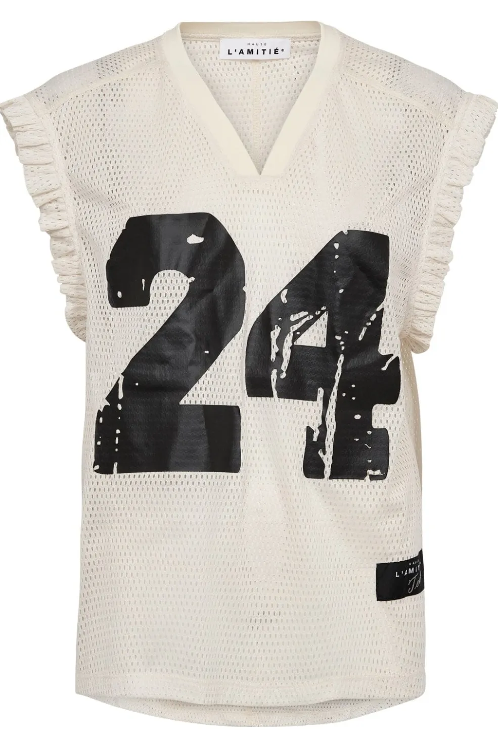 Ærmeløs top fra Haute L’Amitié i perlefarve med v-hals og flæsedetaljer. Toppen har et stort sort 24-print på fronten.