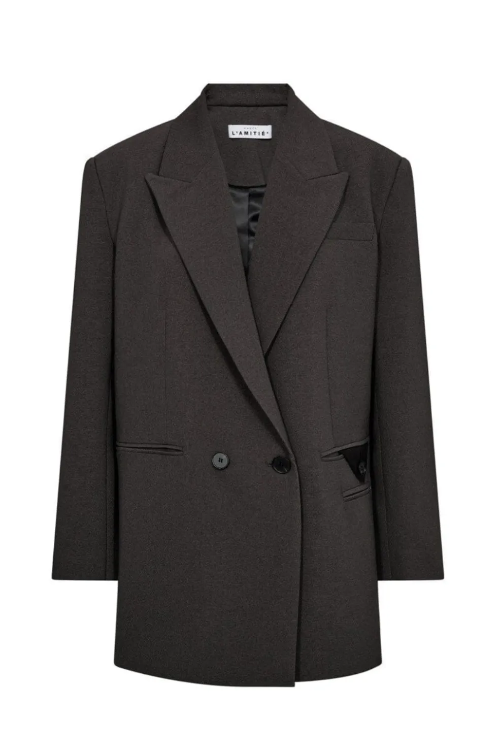Oversize blazer fra Haute L’Amitié i mørkegrå. Blazeren har en dobbeltknappet front med to synlige knapper og brede revers.