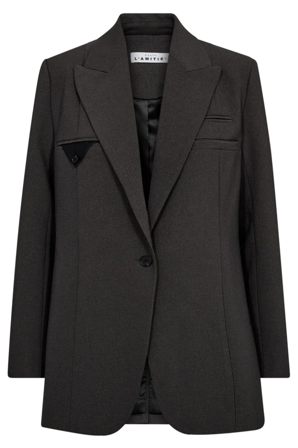 Grå blazer fra Haute L’Amitié med en oversized pasform. Blazeren har notch-lapper, en enkel knaplukning og en brystlomme med en trekantdetalje.