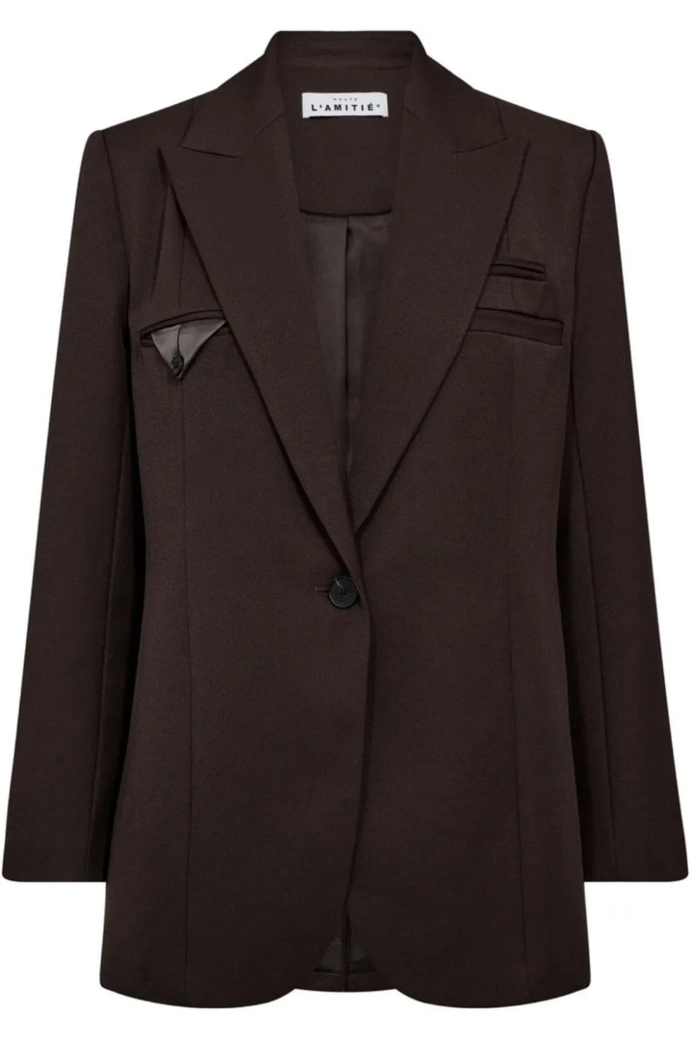Mørkebrun blazer fra Haute L’Amitié. Passer til formelle anledninger, hverdagen og festlige lejligheder. Enkeltknaplukning og polstrede skuldre giver en struktureret profil.