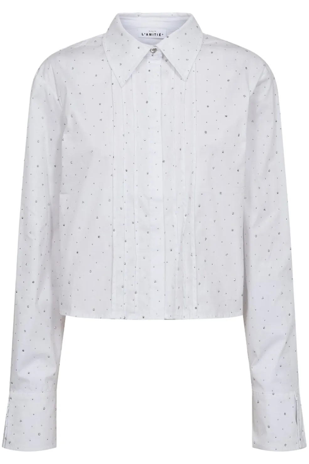 Hvid crop-skjorte fra Haute L’Amitié med rhinsten over hele stoffet. Skjorten har klassisk krave, lange ærmer og en plisseret detalje på fronten.