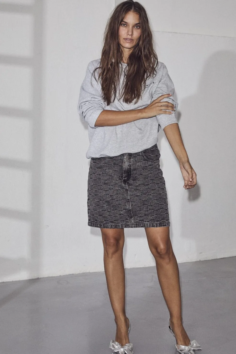 Sort denimnederdel fra Haute L’Amitié i et kvadratisk mønster. Nederdelen er lavet af denim og har en kort længde, der slutter ved låret.