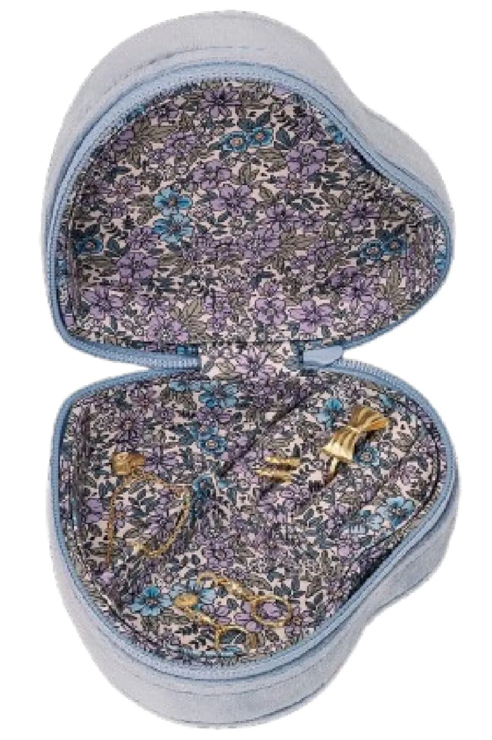 Himmelblå smykkeæske i hjerteform fra Maanesten med broderet Moonchild-tekst på forsiden. Indersiden har et blomstermønster i lilla og blå nuancer.