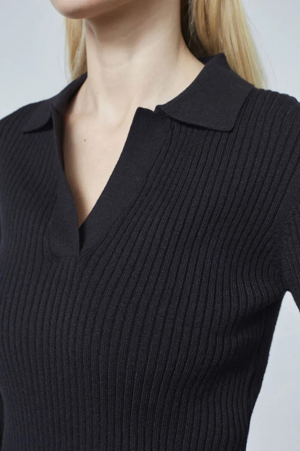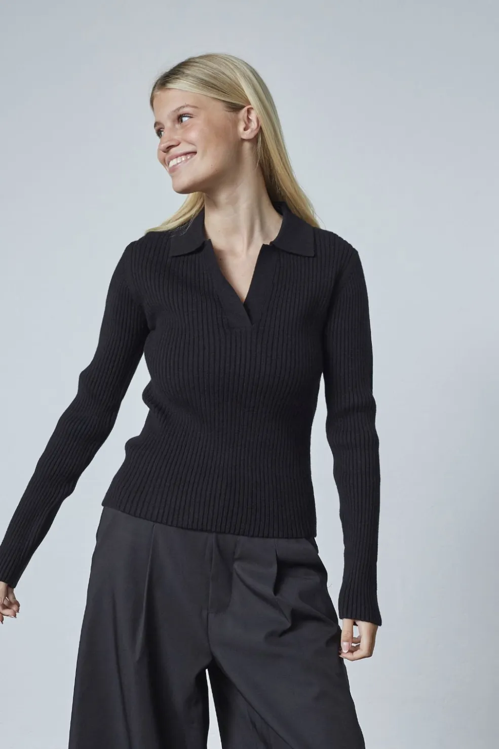 Sort striktrøje fra Sisters Point med en ribstrikket struktur. Trøjen har en klassisk polokrave kombineret med en V-udskæring.