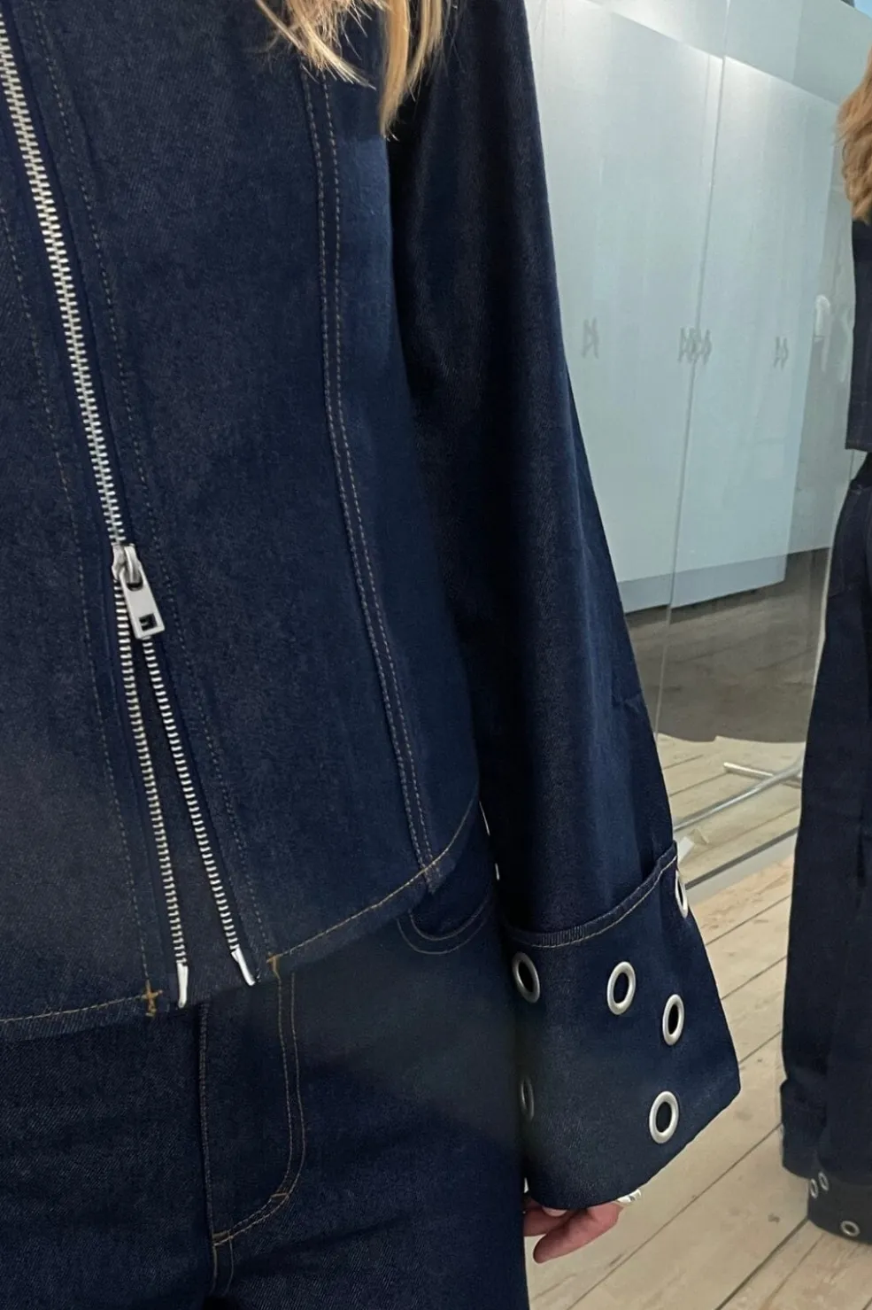Mørkeblå denimjakke fra MbyM med skjortekrave og lynlåslukning. Jakken har lange ærmer med øjeringe og en praktisk frontlynlås, der giver nem adgang.