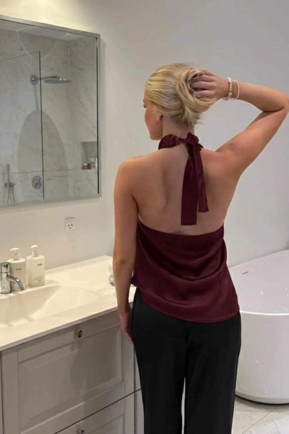 En elegant halterneck-top fremstillet af skinnende satin med en smukt draperet front. Det brede bånd ved halsen skaber et sofistikeret look og en åben ryg, hvilket tilføjer et feminint og raffineret touch. Det bløde satinmateriale har en let stræk, der giver en flatterende pasform og en luksuriøs følelse mod huden. Perfekt til både særlige lejligheder og forfinede hverdagslooks – style den med skræddersyede bukser eller en nederdel for et moderne, tidløst outfit. True to size.