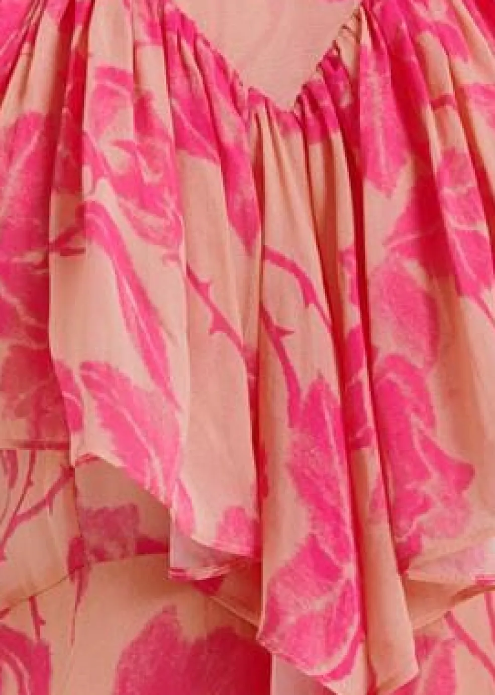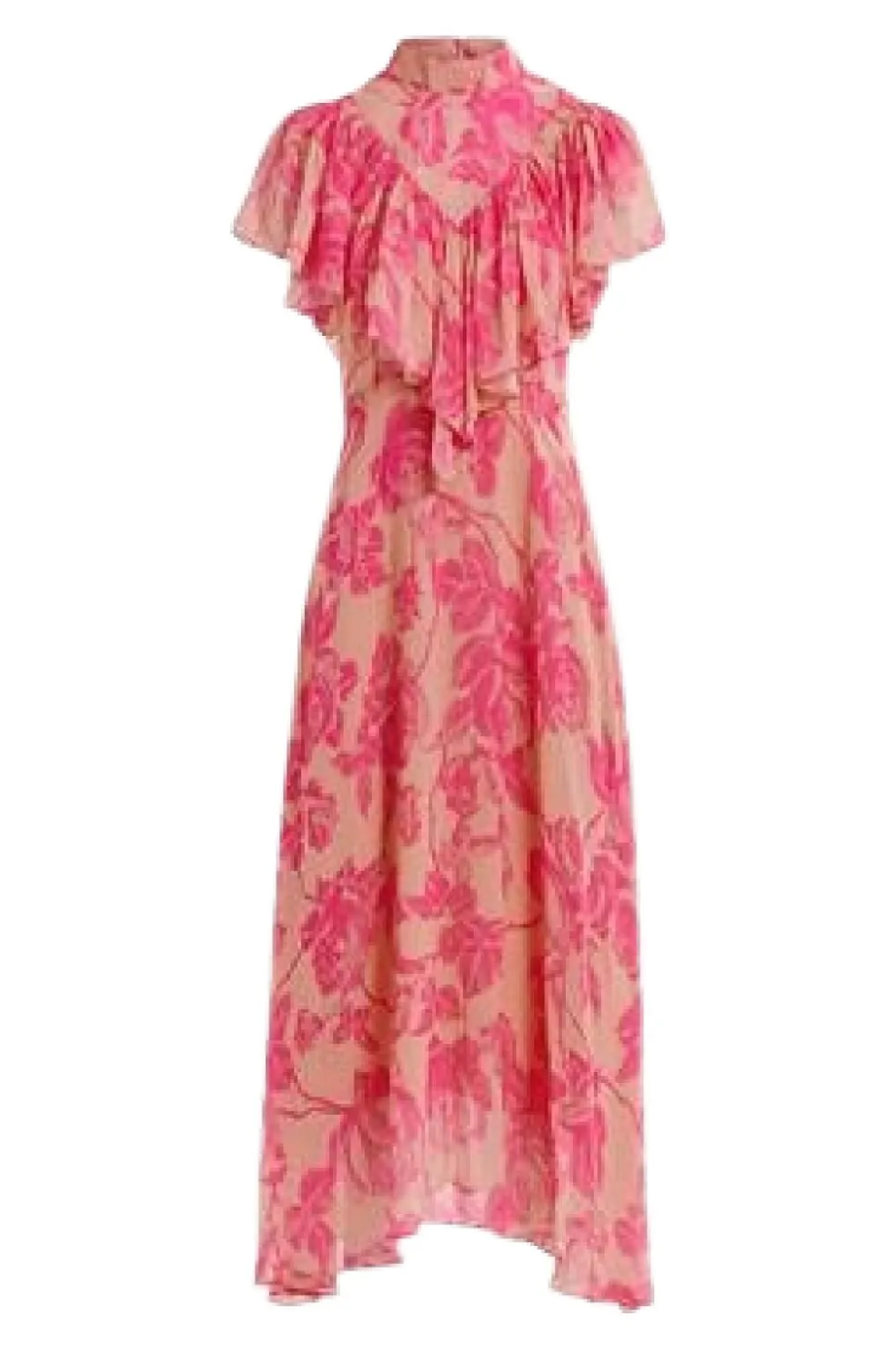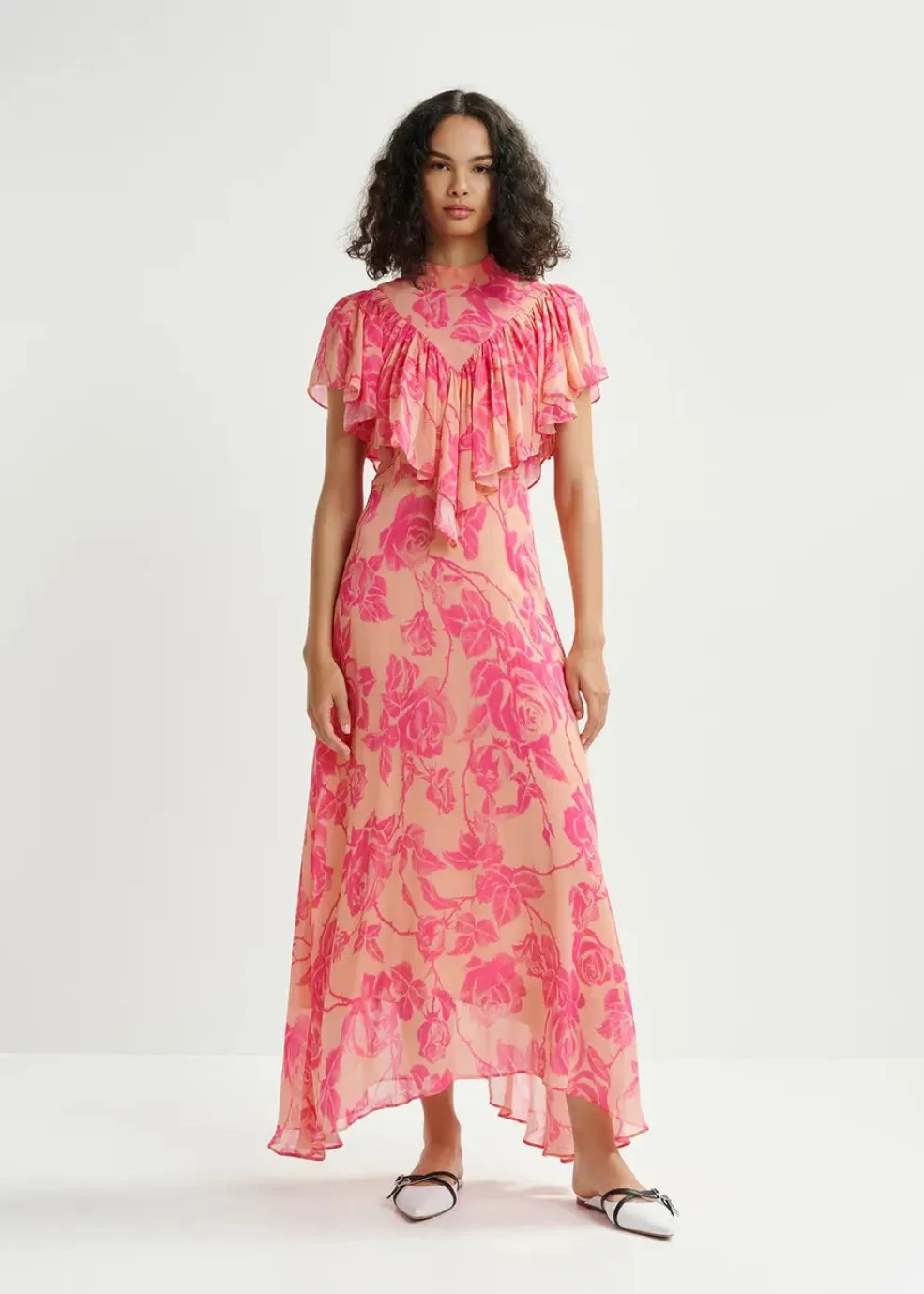 Lang kjole fra Essentiel Antwerp med pink blomstermønster på lys beige baggrund. Kjolen har høj hals, korte ærmer og rynkede detaljer, der skaber bevægelse i stoffet.