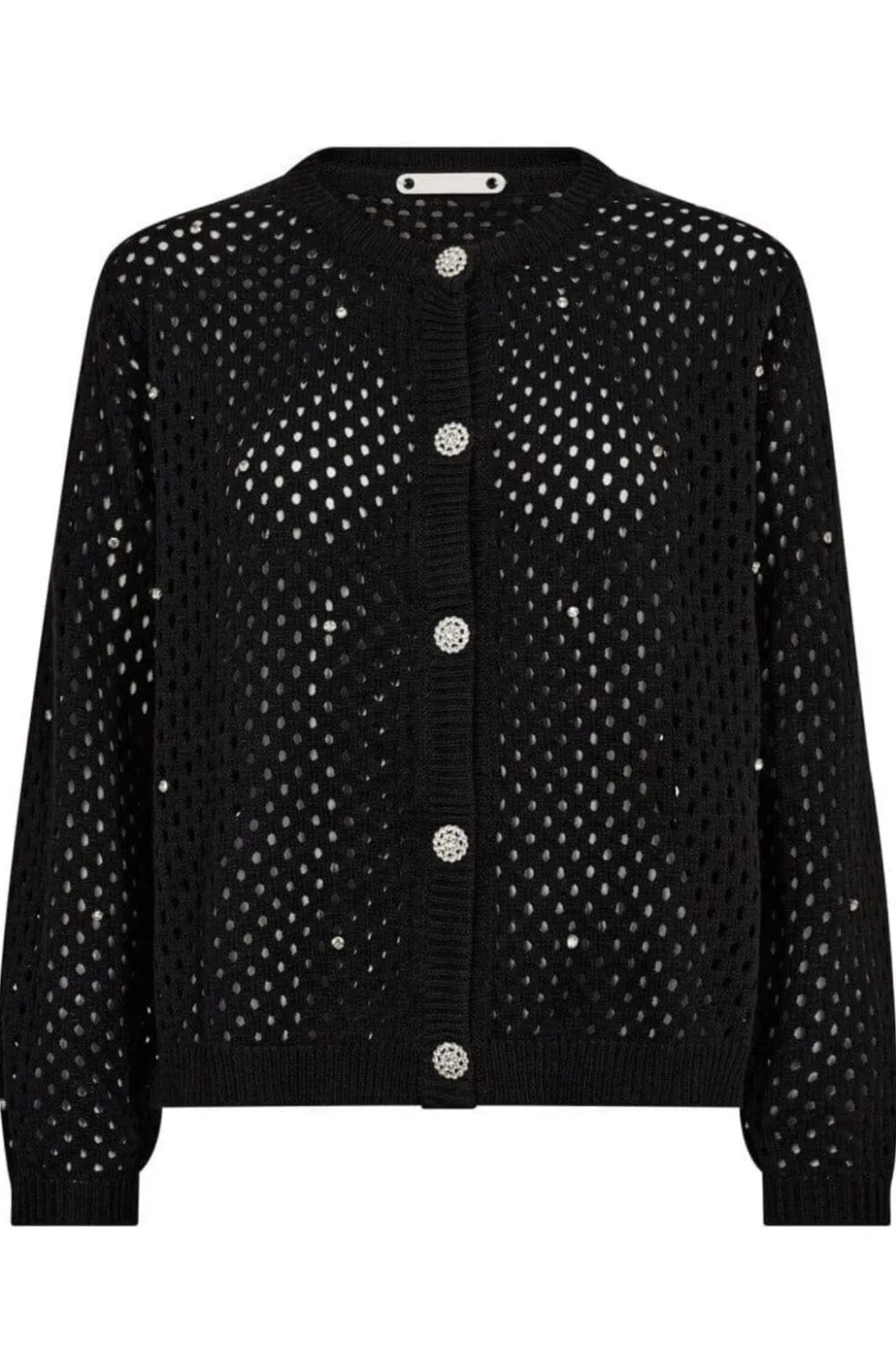 Sort cardigan fra Co’Couture med et gennemsigtigt mesh-mønster. Cardiganen har krystal-lignende knapper og pailletter, der giver et festligt udtryk.