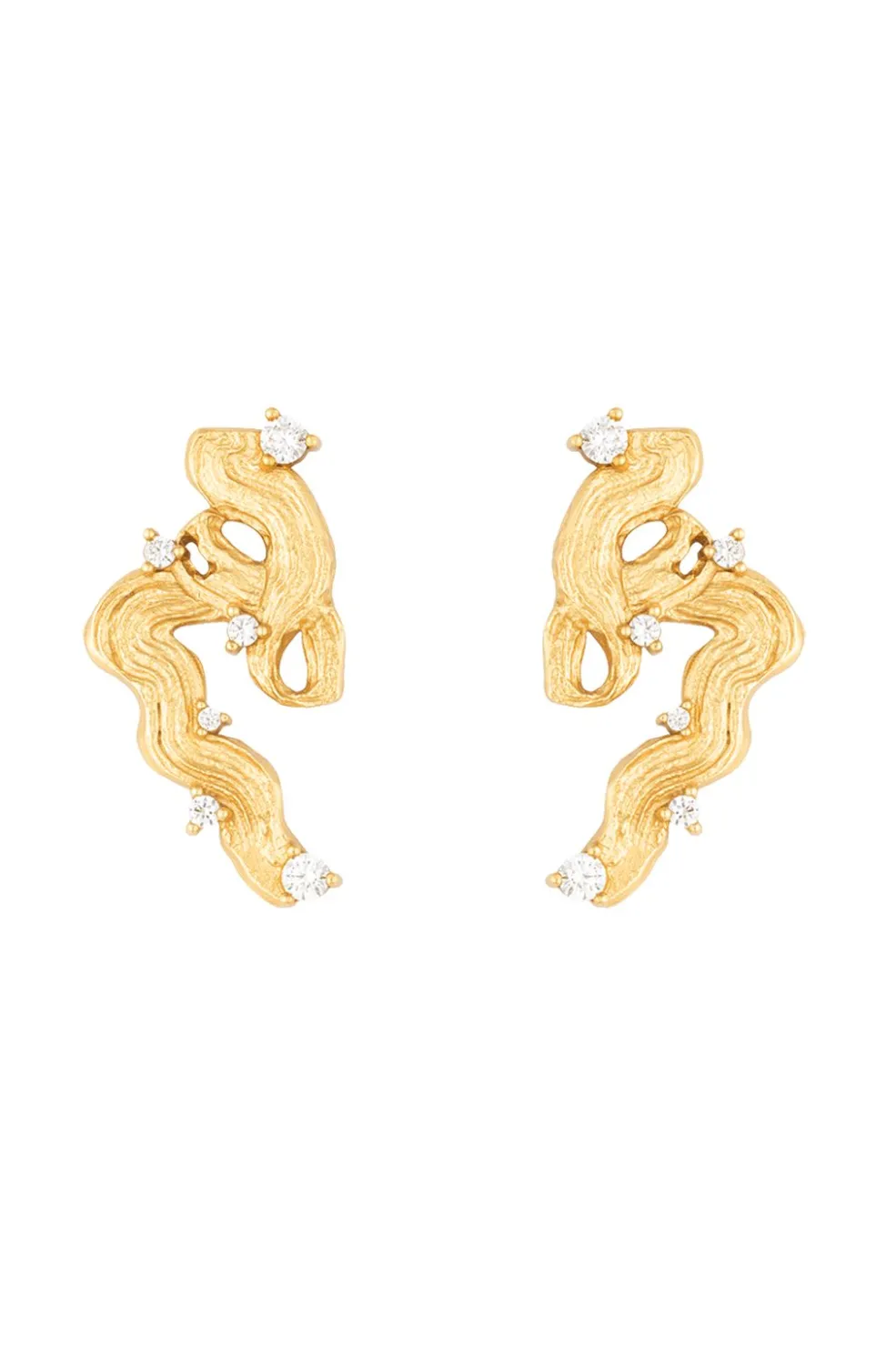 Gyldne øreringe fra House Of Vincent med et bølget design. Øreringene har en struktureret overflade og små klare sten fordelt langs det snoede mønster.