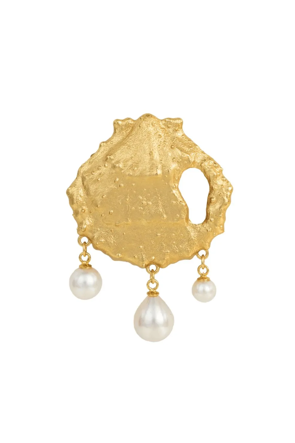 Forgyldt broche fra House Of Vincent med skalform og tre perlehængende elementer. Brochen har en struktureret overflade og kombinerer det gyldne metal med hvide perler.