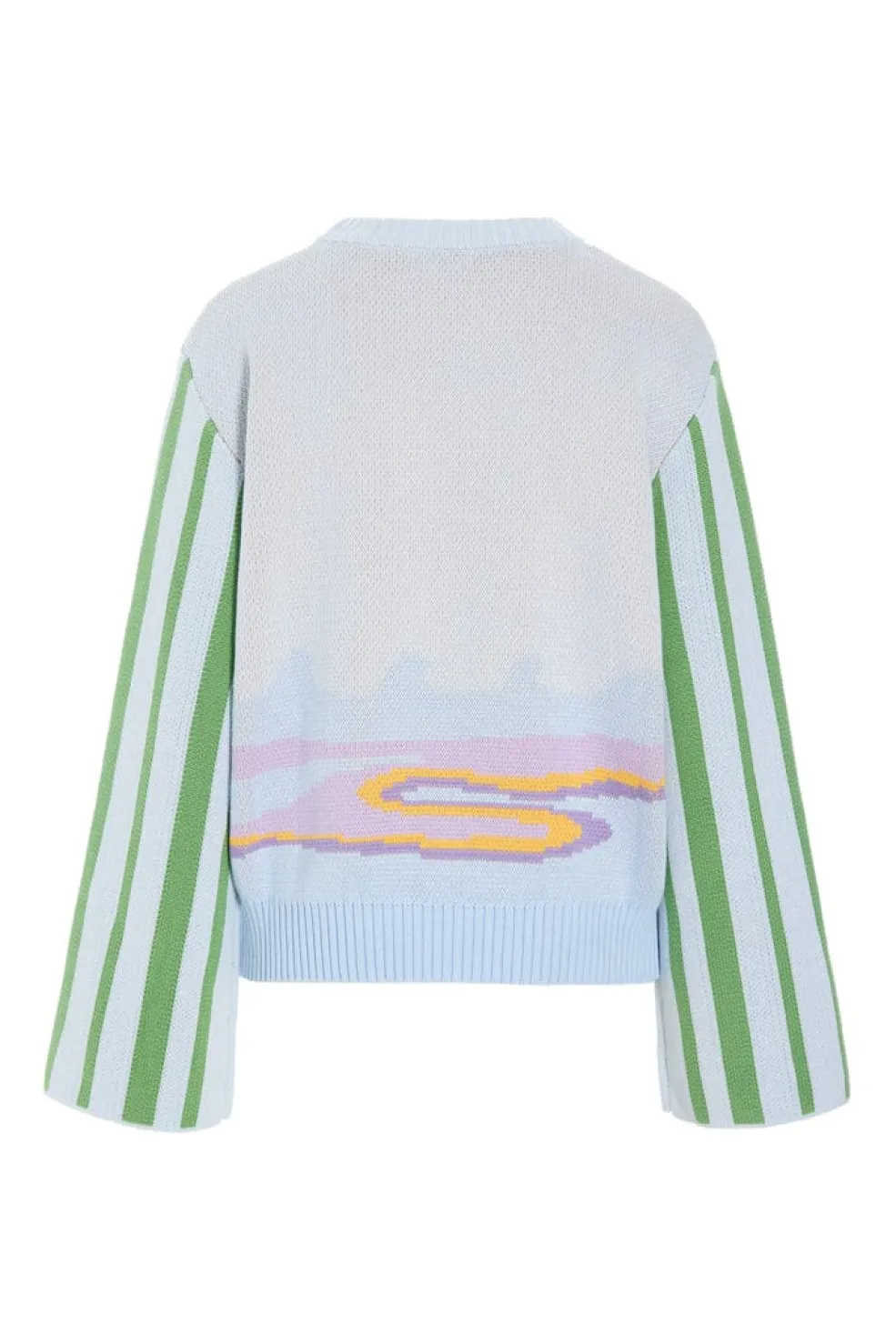 Bluse fra Hunkøn i farven Blue Sea. Den har et broderet motiv med sol og båd på forsiden og vertikale striber på ærmerne.