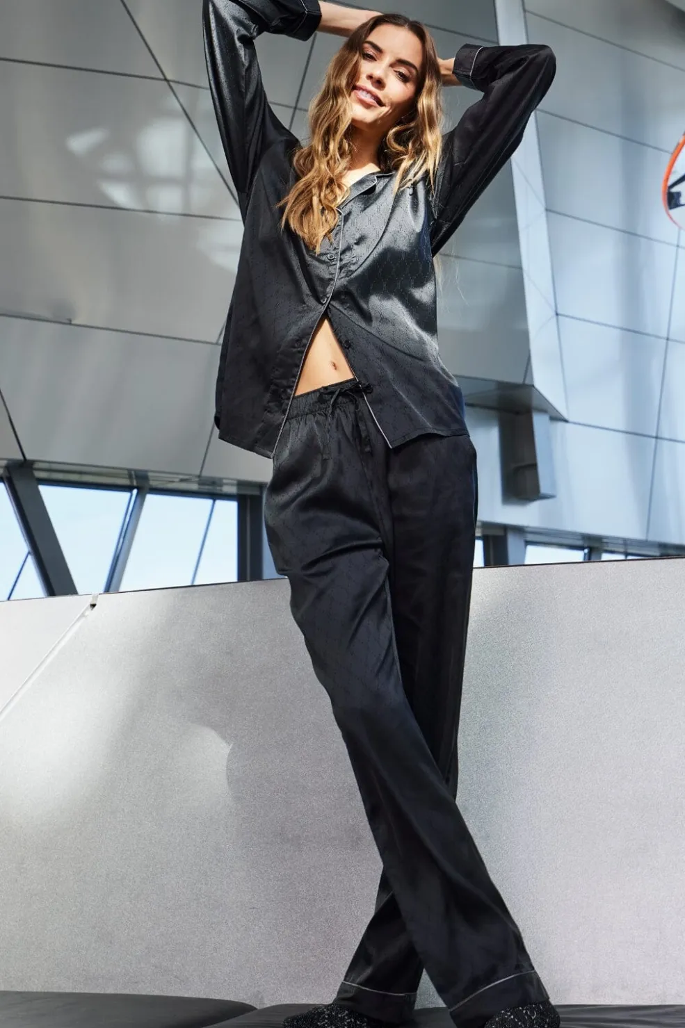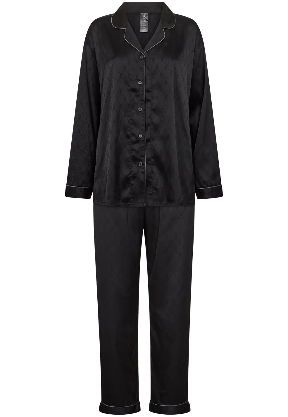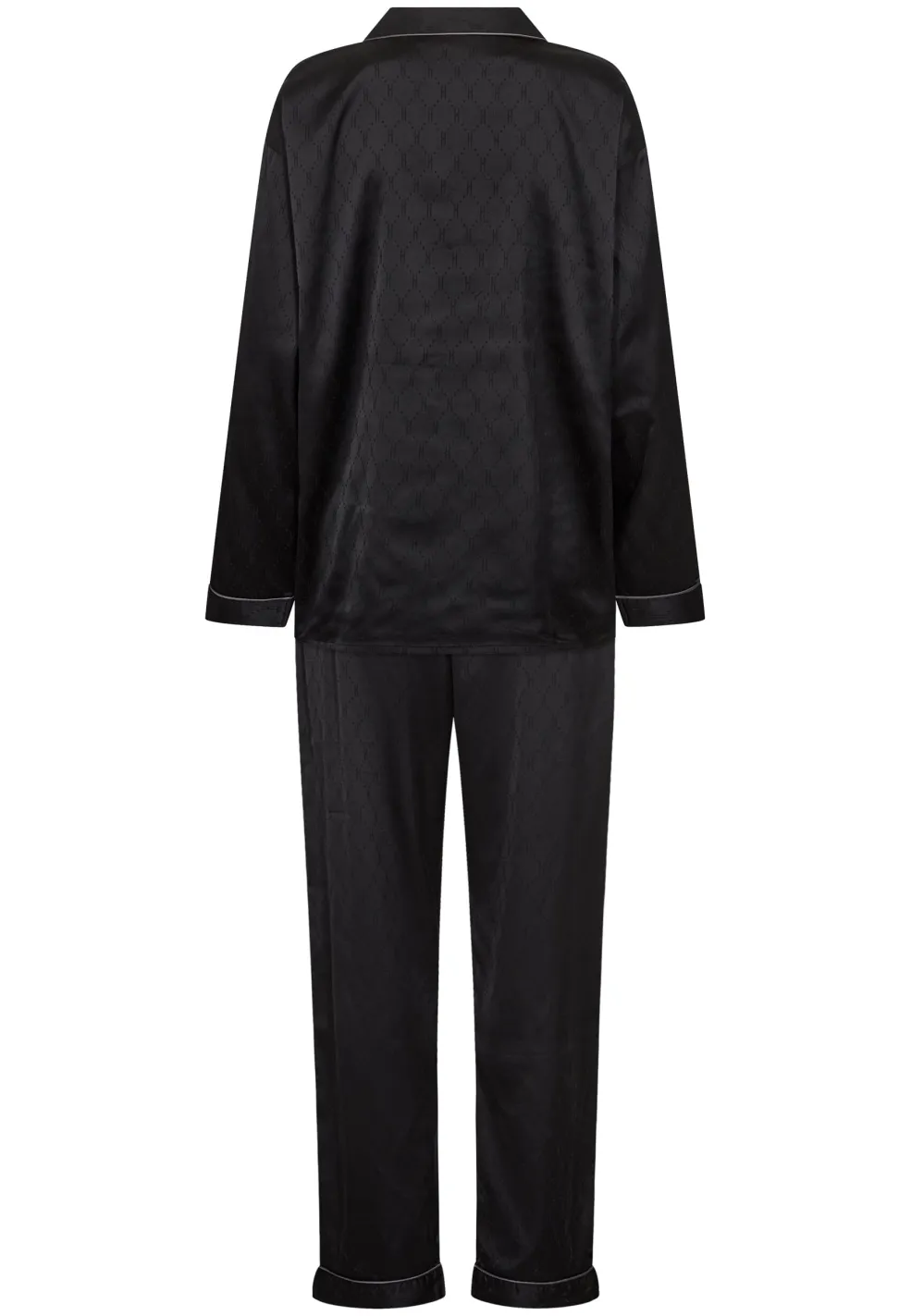 Sort satinpyjamas fra Hype The Detail med skjortekrave og lange ærmer. Sættet har bindebånd og dekorative syninger, der giver et stilrent udtryk.
