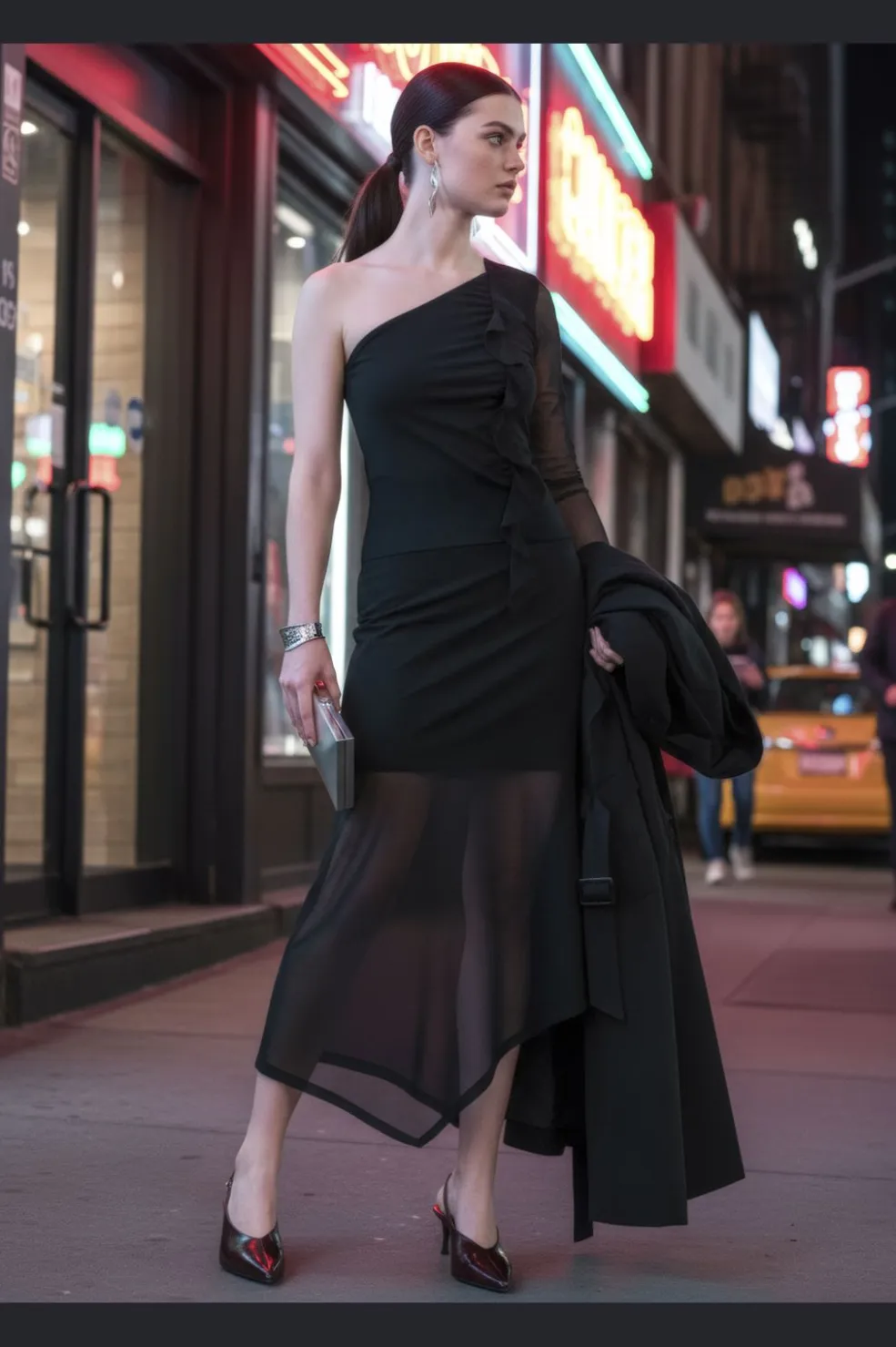 Sort top fra Hypedrop med én-skulderdesign og flæsedetaljer. Toppen har et gennemsigtigt meshærme på den ene side og en tætsiddende pasform.