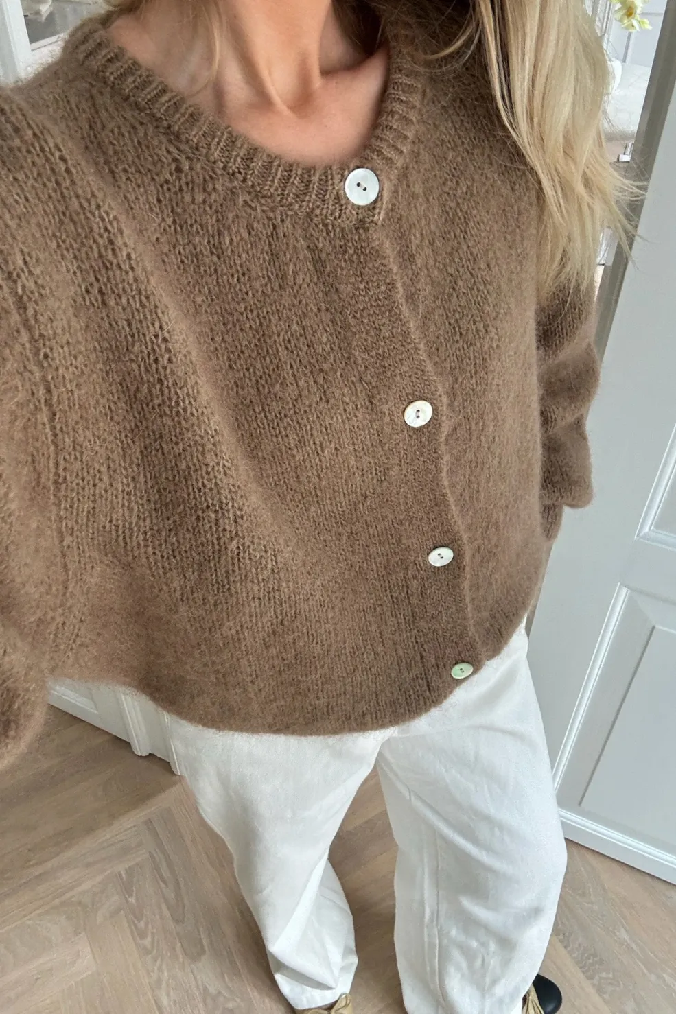 Brun cardigan fra BYIC med store knapper. Den er strikket i en blød blanding af mohair og uld, som giver en luftig og varm fornemmelse mod huden.