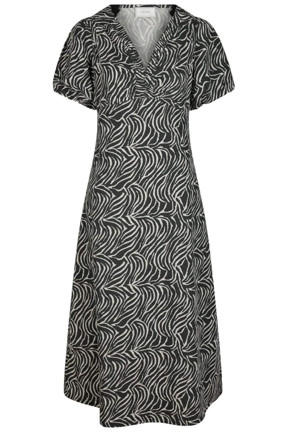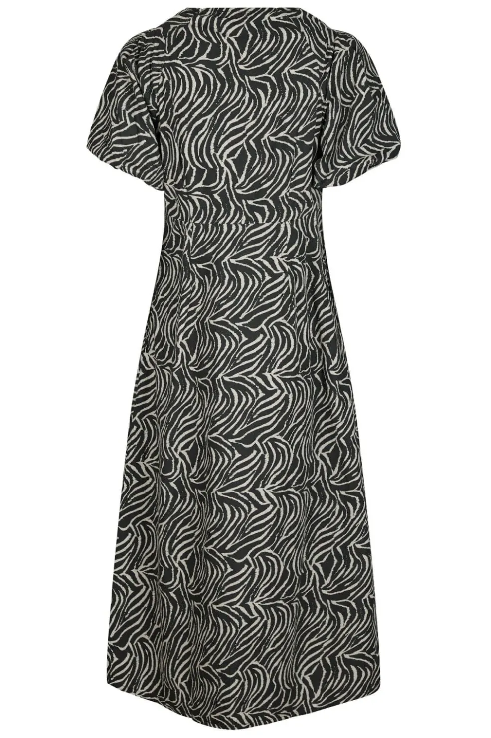 Sort og hvid kjole fra Neo Noir med zebrastriber. Kjolen har korte puffærmer og en V-halsudskæring. Den går til midt på læggen og er lavet af et let bomuldsstof.