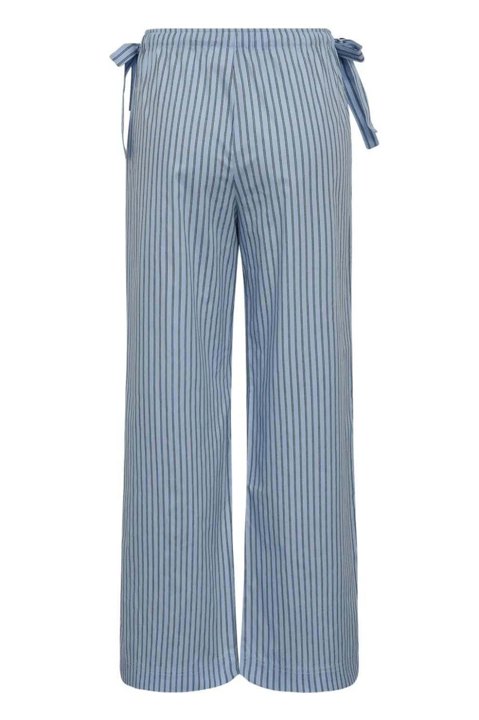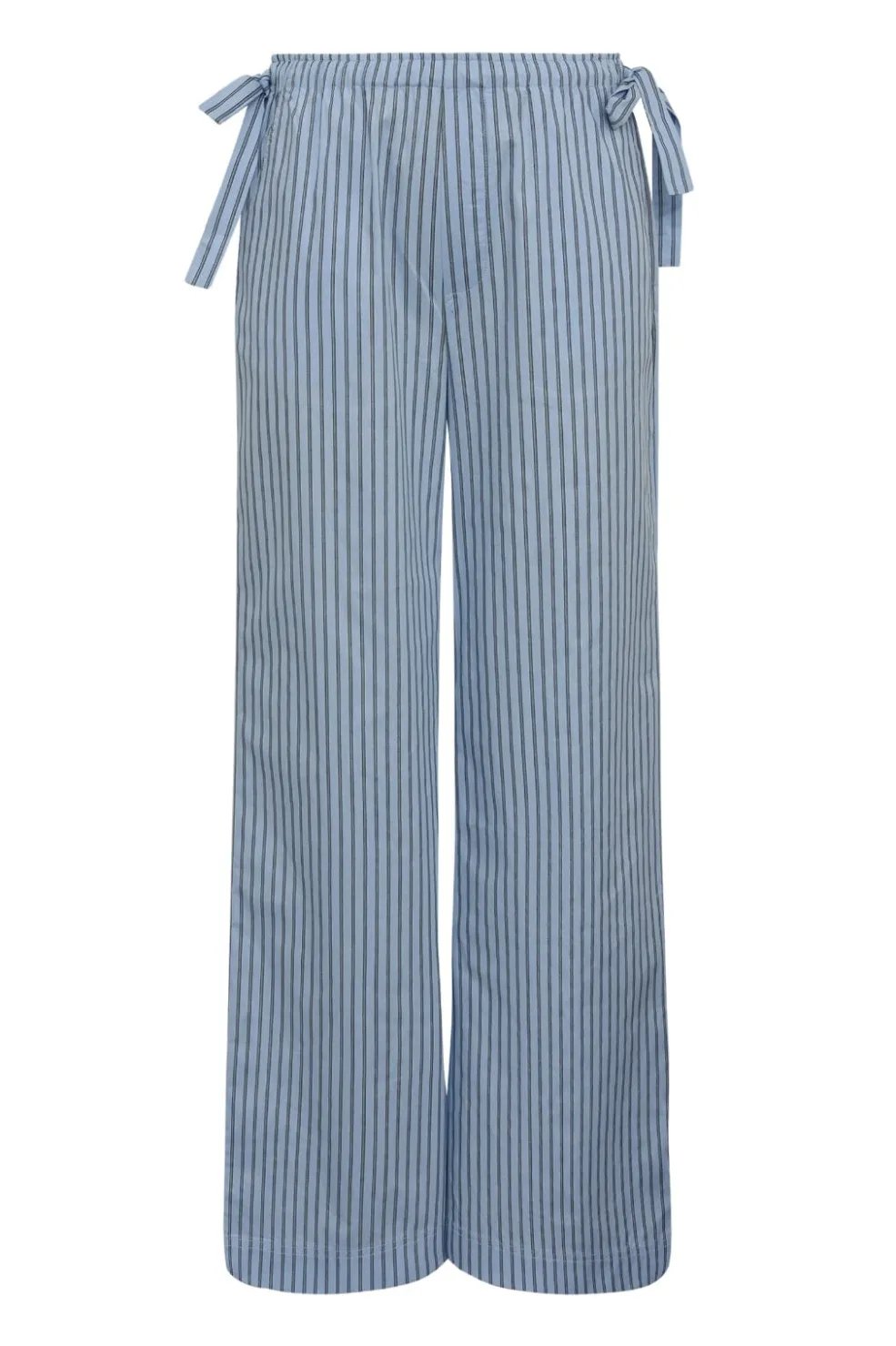 Lyseblå stribede bukser fra MbyM med høj talje og gulvlang længde. De lodrette striber og bindebåndsdetaljer giver bukserne et let og afslappet udtryk.