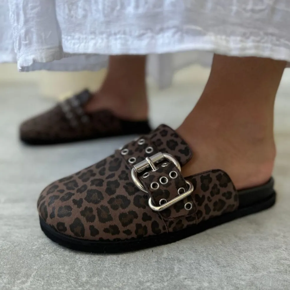 Ruskindloafers fra Copenhagen Shoes med brunt leopardprint. Skoen har en lav hæl og rund tå, der sammen med spændelukningen skaber en praktisk hverdagssko.