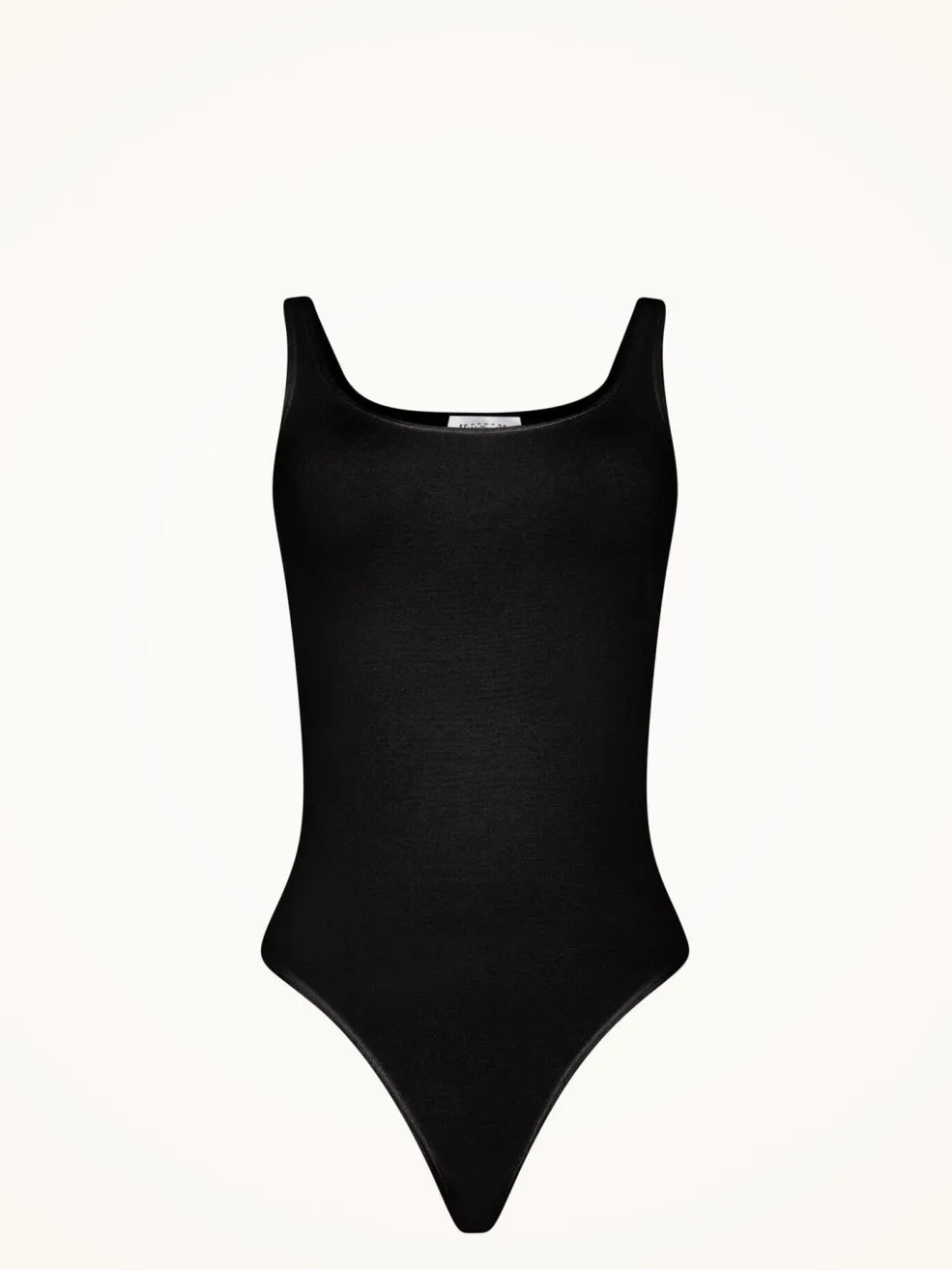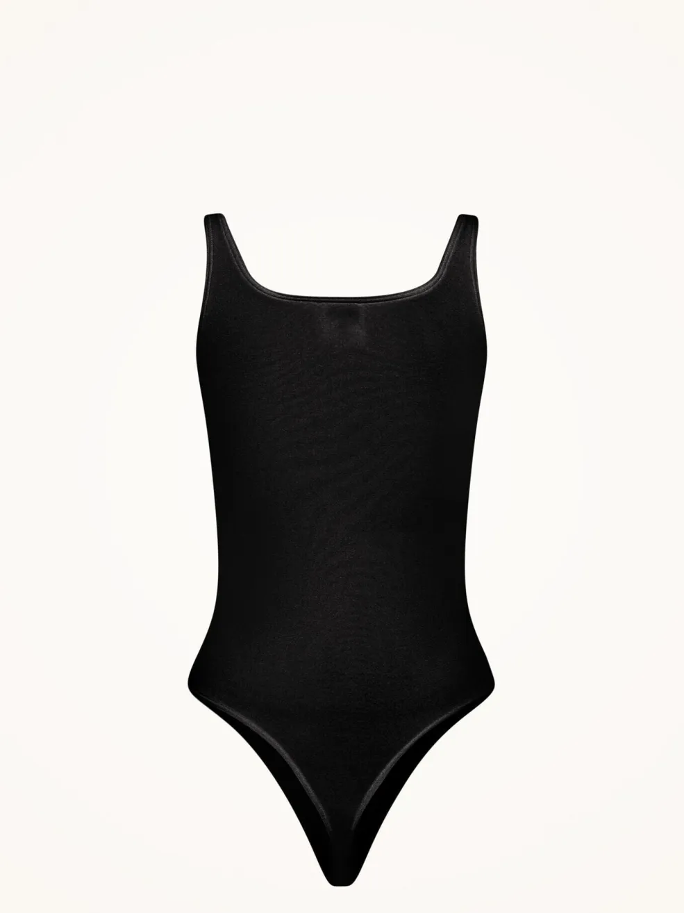 Sort stringbody med rund halsudskæring og høje benåbninger. Den tætsiddende pasform og thong-stil giver en glat silhuet under tøjet.
