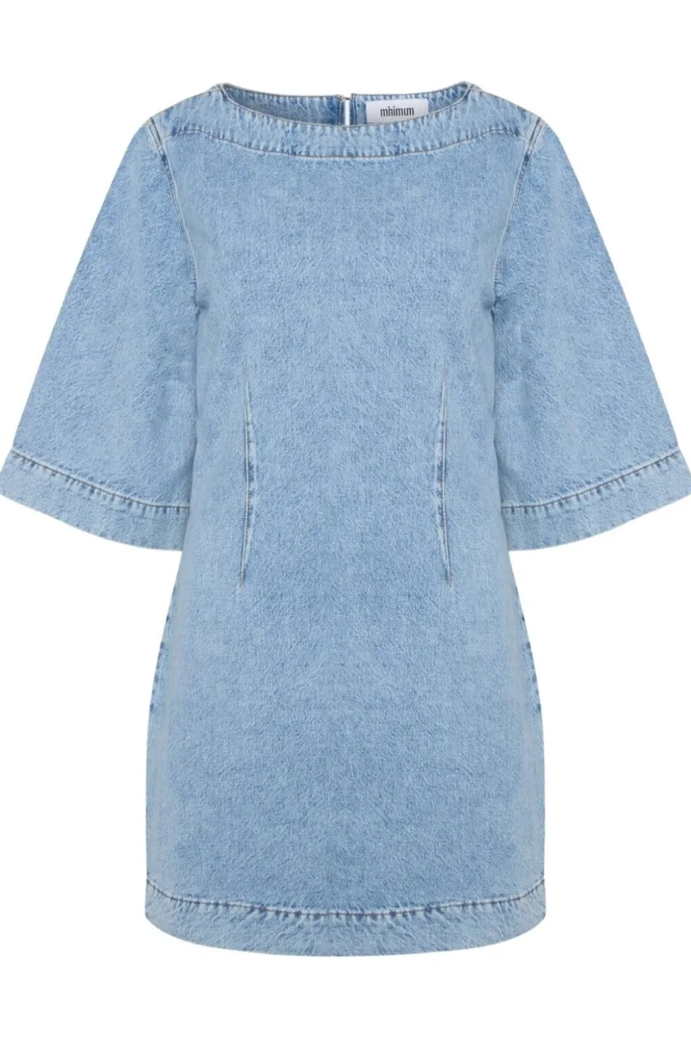 Lys blå denimkjole fra Moves By Minimum med lodrette sømme og lynlås i ryggen. De korte klokkeærmer og den runde halsudskæring giver kjolen et rent design.