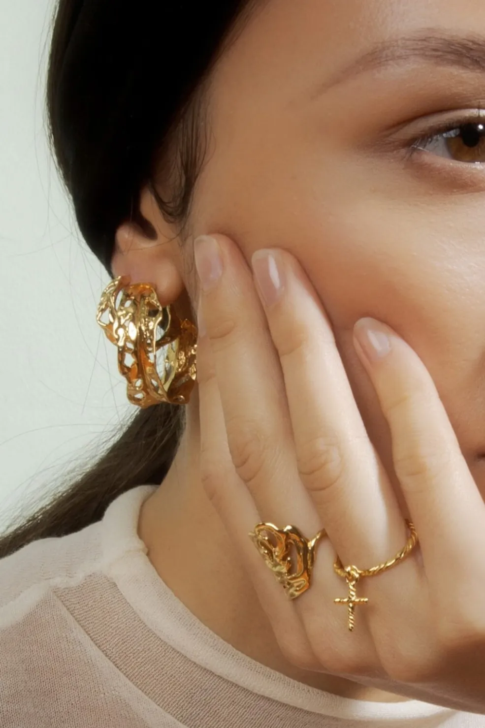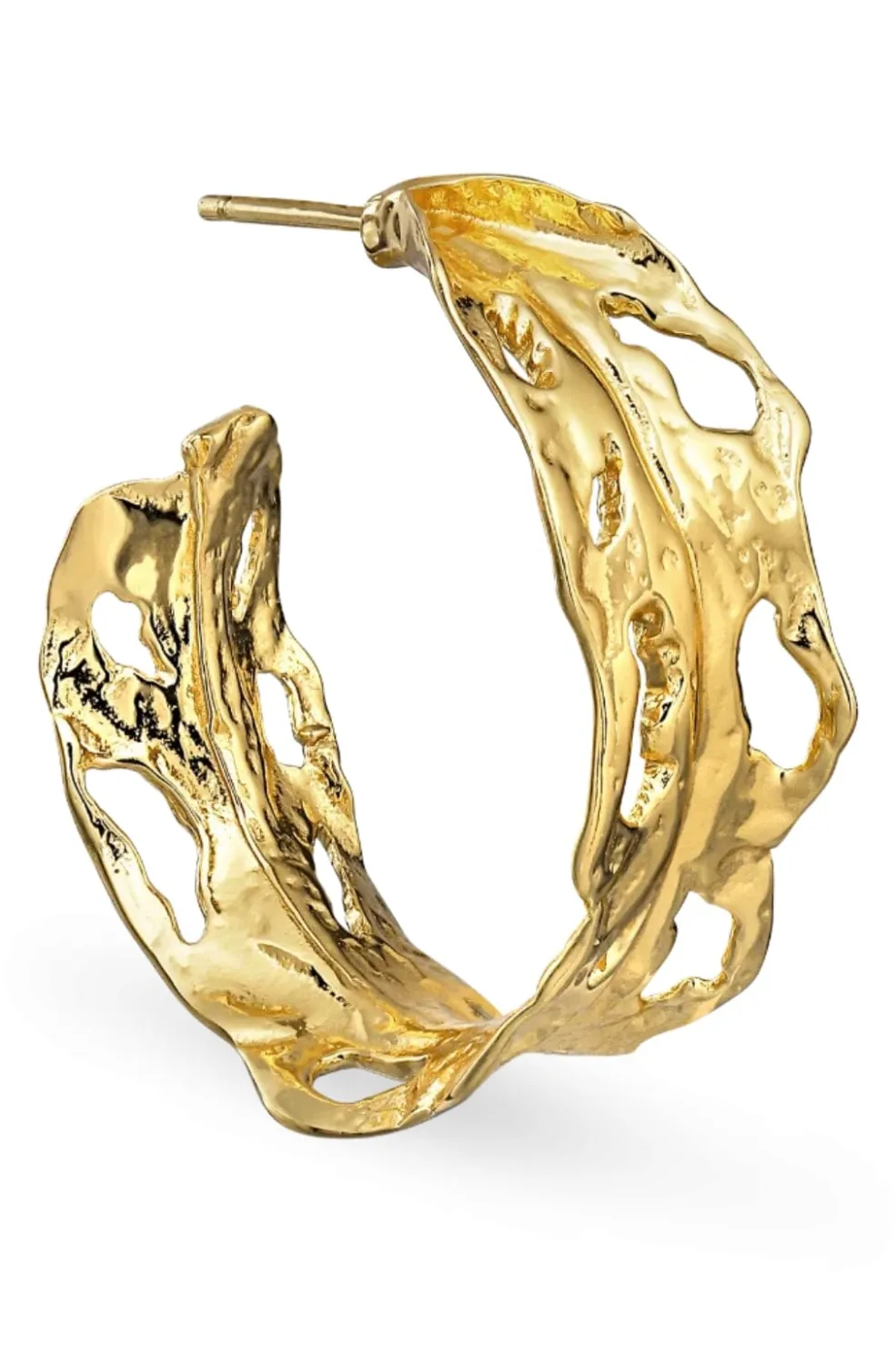 Forgyldt hoop-ørering fra Jane Kønig med en organisk bladform. Øreringen har ujævne kanter og huller i designet, fremstillet i sterling sølv med en gylden overflade.
