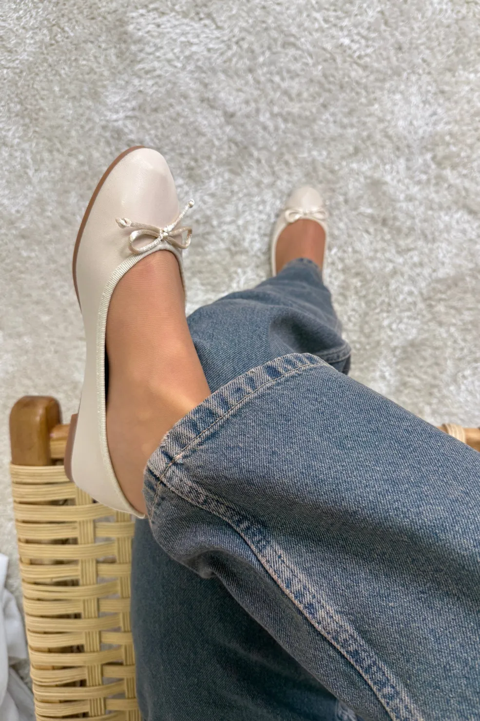 Beige ballerina fra Bloom med rund tå og lav hæl. Den har en lille sløjfe foran og er lavet i et glat syntetisk materiale.