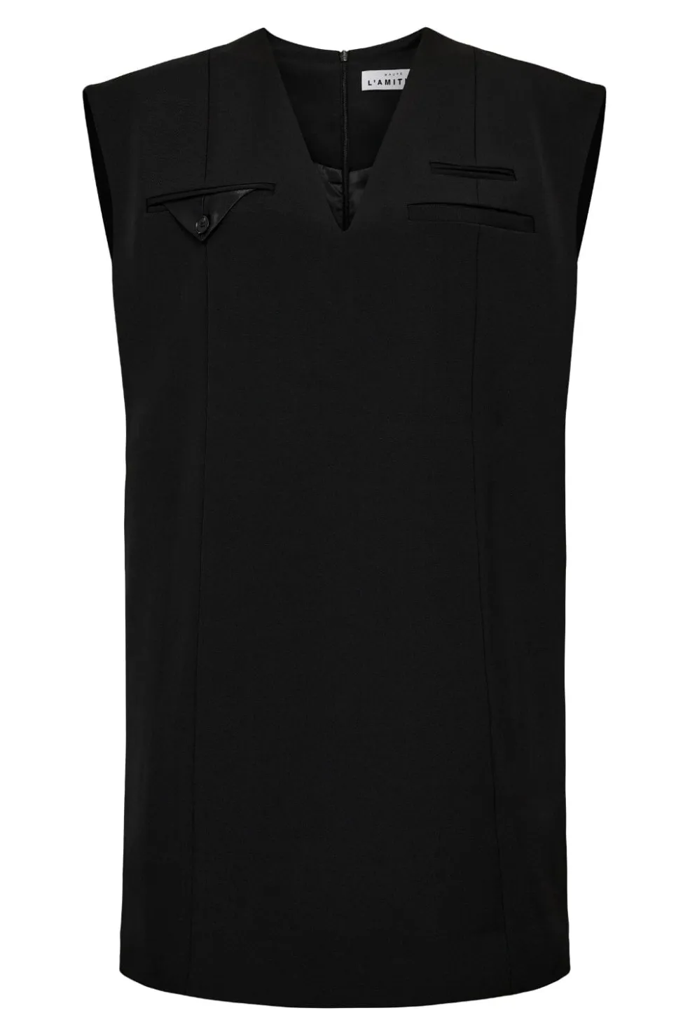Sort kjole fra Haute L’Amitié, lavet til festlige lejligheder. Kjolen har et ærmeløst design med V-udskæring og dekorative syninger på brystområdet.