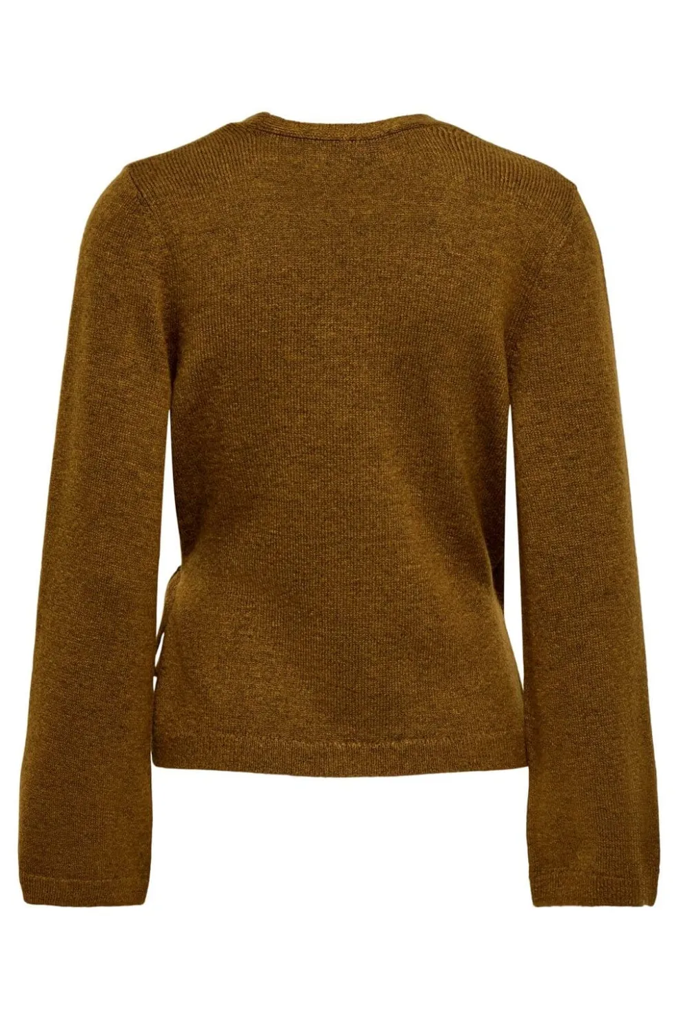 Brun cardigan fra JDY med slå-om-design og lange ærmer. Cardiganen er lavet i en brun meleret farve og har bindebånd i siden.