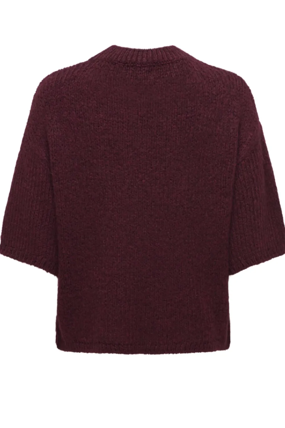 Striktrøje fra JDY i en dyb bordeauxnuance. Trøjen er lavet af 80% akryl og 20% polyester med en O-hals og 3/4 ærmer.
