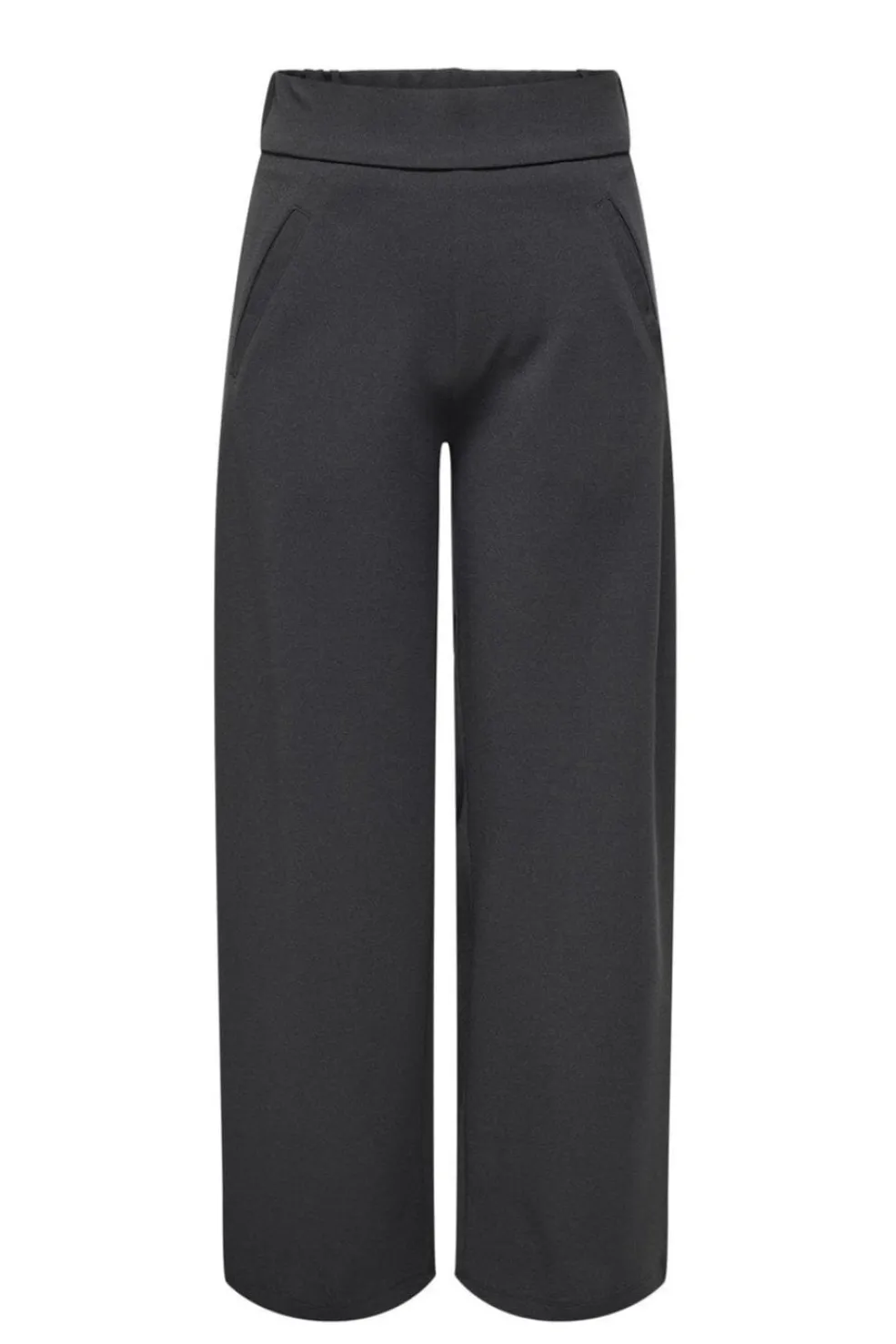 Wide-leg bukser fra JDY i mørk grå. Bukserne har høj talje, bred elastik i linningen og sidelommer.