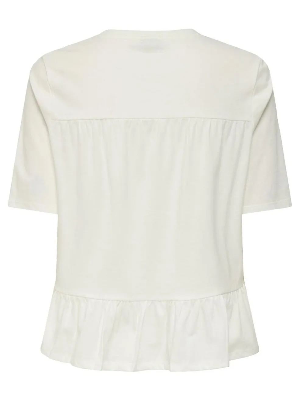 Hvid top fra JDY med perledetaljer og flæsekanter. Toppen har en rund halsudskæring og korte ærmer. Den cremehvide farve og de dekorative perler giver toppen et feminint præg.