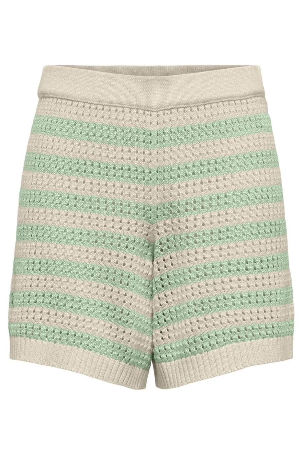 Strikkede shorts fra JDY med striber i beige og mintgrøn. Shortsene har et luftigt hulmønster og en elastisk linning i taljen. Regular fit-pasform med lårkorte ben.