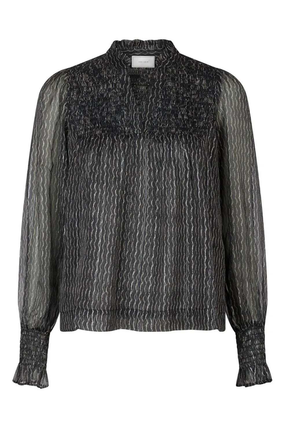 Mørkeblå bluse fra Neo Noir med bølgende mønster. Den transparente bluse har V-hals og lange ærmer med smock-detaljer ved håndleddene.