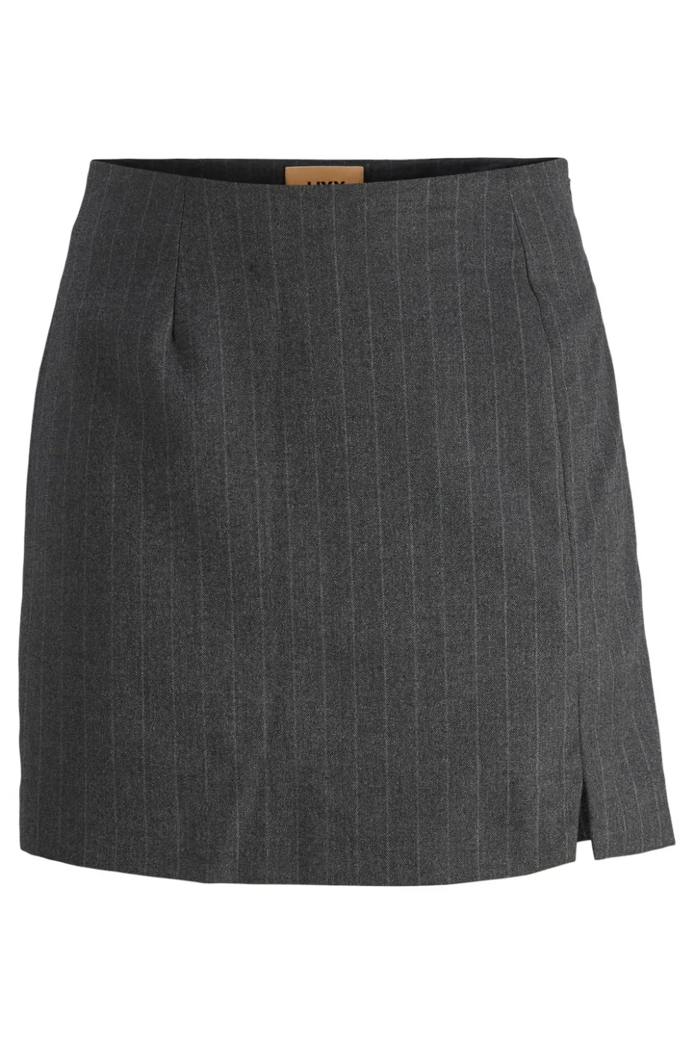Mørkegrå nederdel fra Jjxx med lys grå striber. Den børstede overflade giver et blødt udtryk, mens pinstripe- og herringbone-mønsteret skaber et klassisk look.