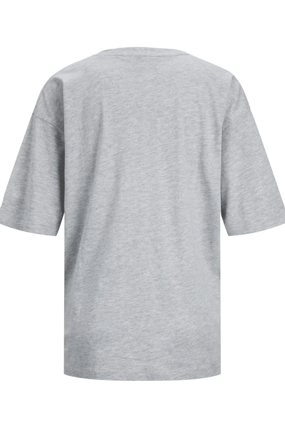 Lysegrå t-shirt fra Jjxx i jersey-stof med et diskret logo-print. T-shirten har en loose fit-pasform med korte ærmer og rund halsudskæring i et meleret look.