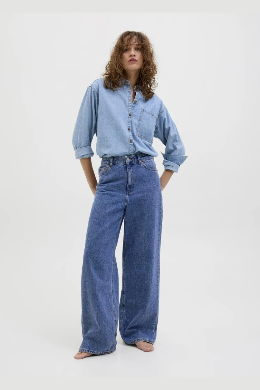 Løft din hverdagsgarderobe med vores essentielle denimjeans. Disse tidløse jeans er skabt til komfort og alsidighed og er et must-have i enhver garderobe. De er perfekte til enhver lejlighed og supplerer ubesværet dine yndlingsstykker.Denim er et slidstærkt twillstof, der er kendetegnet ved et farvet kædegarn og skud, der er vævet sammen.- Produkttype: Jeans i wide fit – Lukning: Gylp med lynlåslukning – Lommer: Baglommer, møntlomme, forlommer – Talje: Høj talje – Detaljer: Bæltestropper, nitter – Vask/behandling: Stone wash for et falmet, slidt look – Pasform: Høj talje, afslappet pasform, wide leg fit