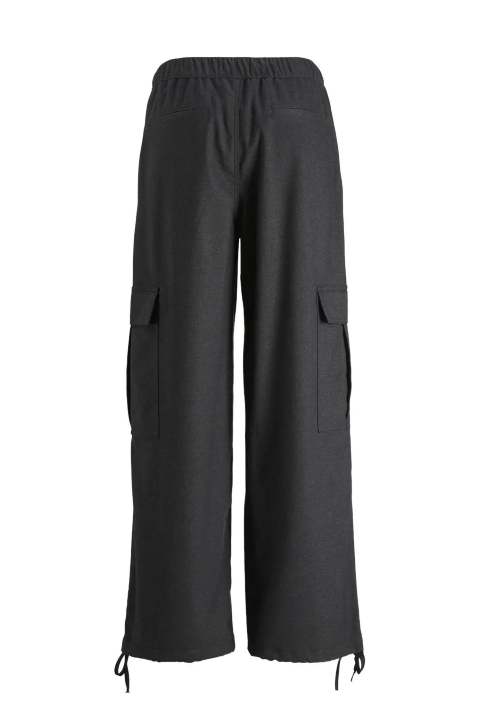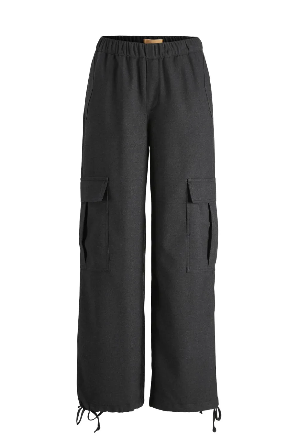 Mørkegrå cargo-bukser fra Jjxx med løs pasform og elastisk talje. Bukserne har praktiske cargo-lommer på siderne og snøre i taljen, der giver mulighed for justering.