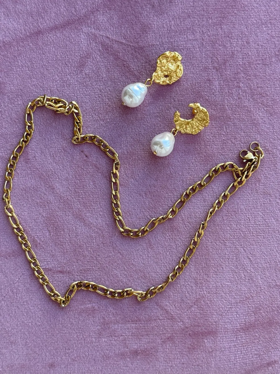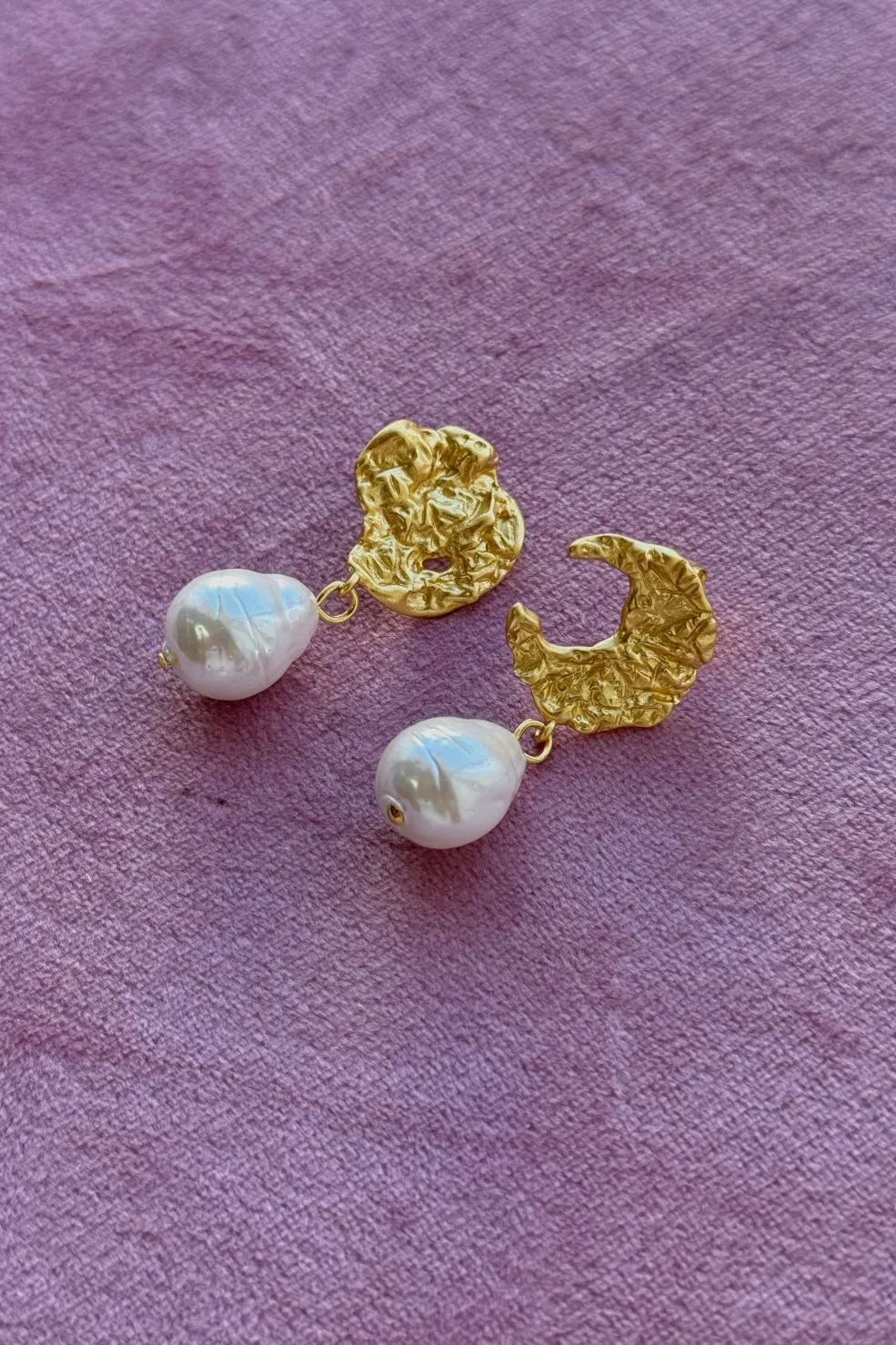 Øreringe fra Mellow Moon med en struktureret overflade i gylden farve. Den krøllede metaloverflade kombineres med hvide barokperler i bunden.