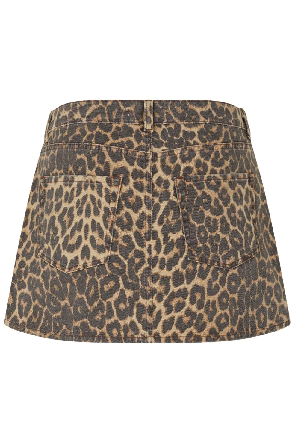 Denimnederdel fra Global Funk i brune og beige nuancer med leopardmønster. Nederdelen har en A-formet silhuet og synlige lommer både foran og bagpå.