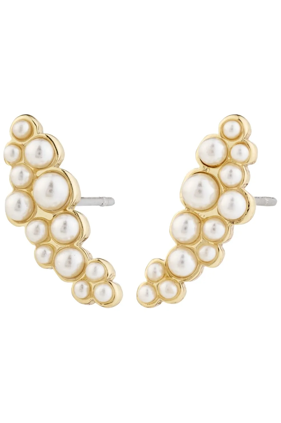 Guldbelagte øreringe fra Pilgrim med perler i forskellige størrelser. Øreringene har en buet form og en let vægt, der gør dem behagelige at bære.