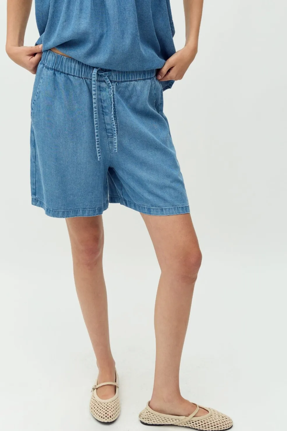 Lyseblå shorts i et blødt og let denimlignende stof. De har en afslappet pasform og er både praktiske til hjemmebrug og hverdagens gøremål.