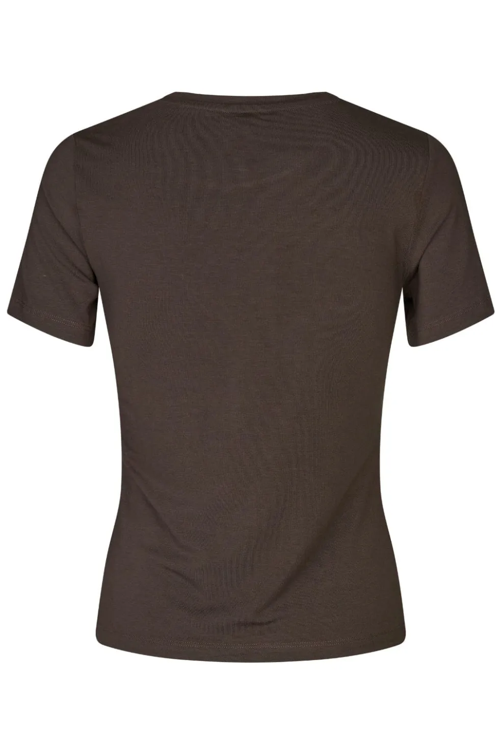 Brun T-shirt fra MbyM i en ensfarvet brun nuance. T-shirten har korte ærmer og en rund halsudskæring.