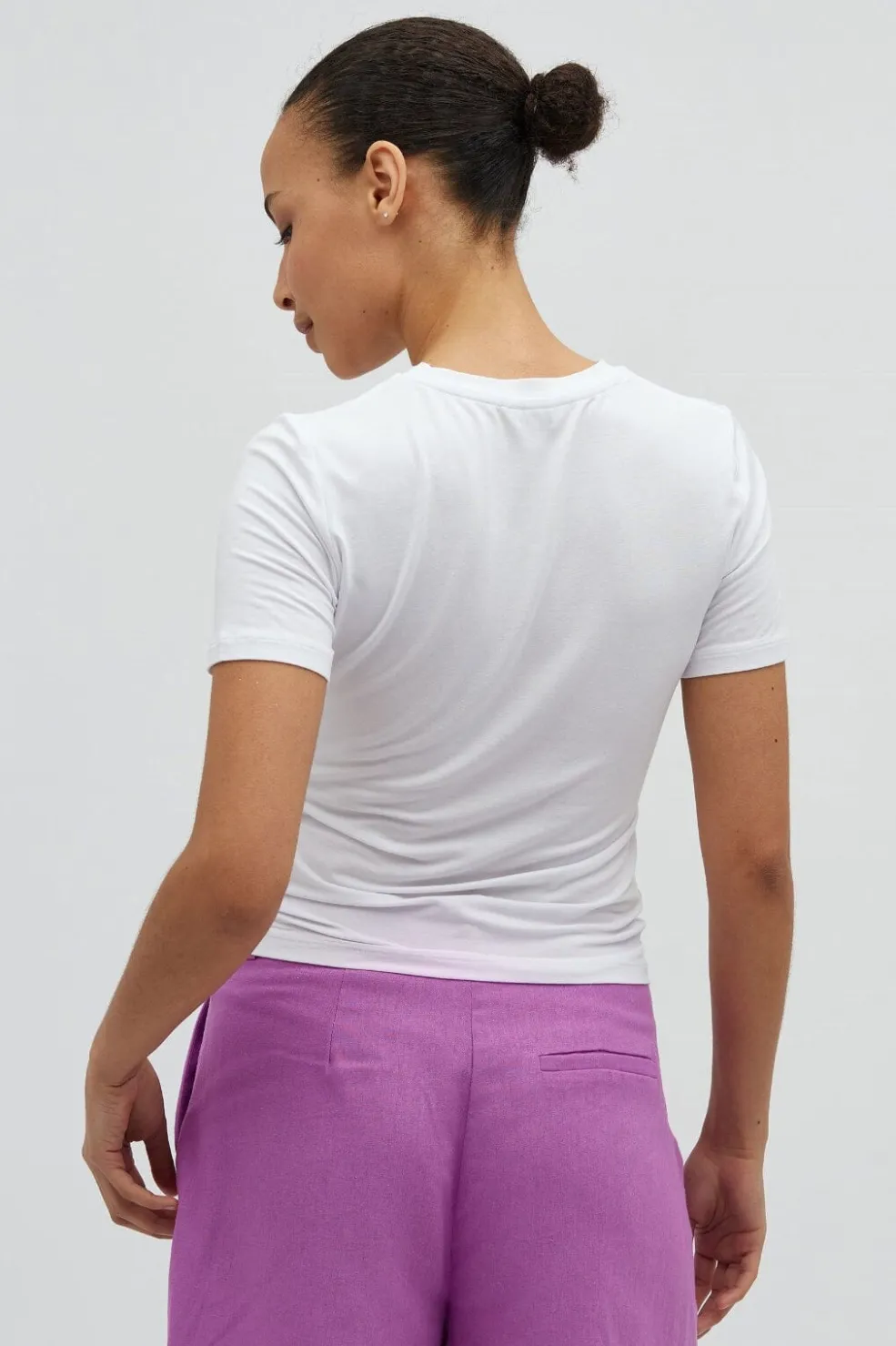 Hvid t-shirt fra MbyM med rund halsudskæring og korte ærmer. T-shirten har en slim fit-pasform og er lavet af blødt TENCEL-materiale.