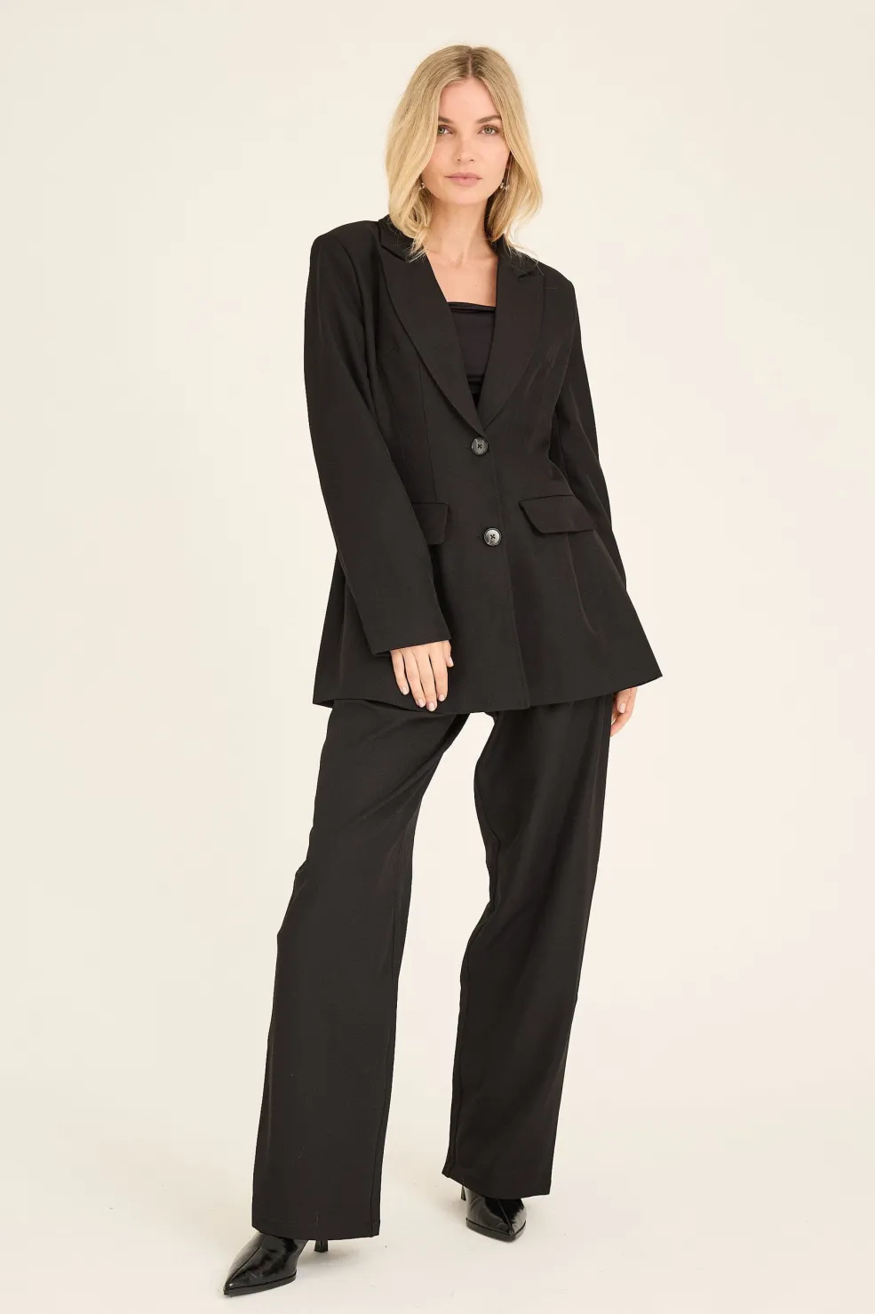 Sorte bukser fra A-View, lavet af 95 % polyester og 5 % elastan. Materialet giver strækbarhed og bevægelsesfrihed til både formelle og afslappede begivenheder.